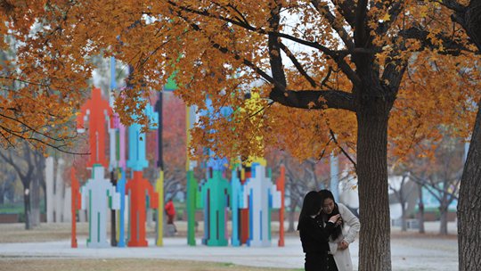 北京冬已至秋景仍存 街头黄叶挂枝头