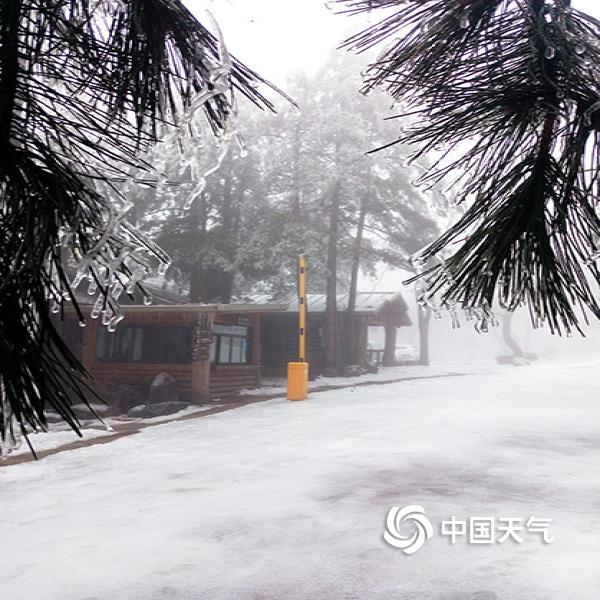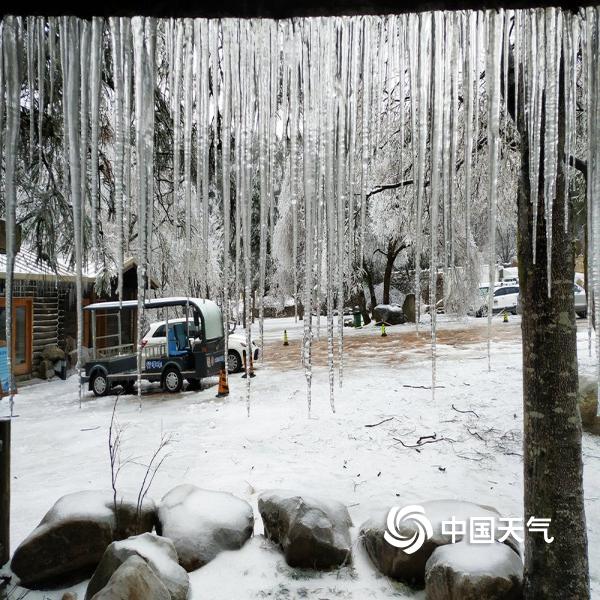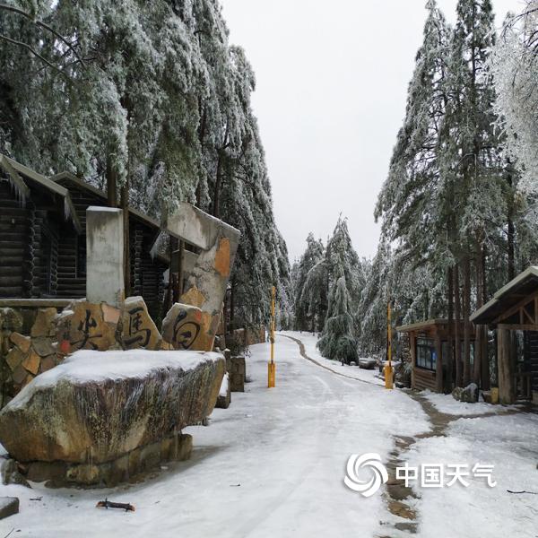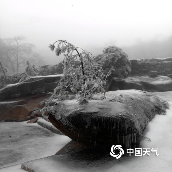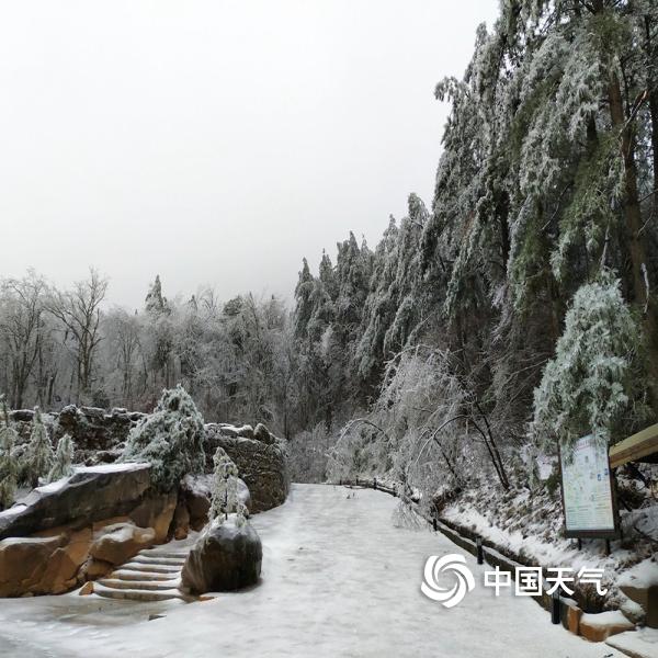 2019年02月21日 09:52近日,大别山主峰白马尖出现冻雨天气,呈现“千岩琉璃,万树晶莹”的美丽景象。图为地面有明显积雪和结冰的景区内部。(摄:陈建)