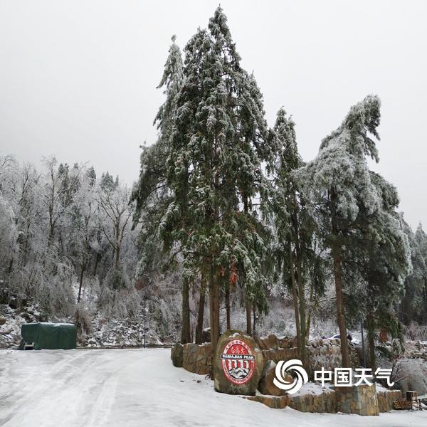 2019年02月21日 09:52近日,大别山主峰白马尖出现冻雨天气,呈现“千岩琉璃,万树晶莹”的美丽景象。图为被冻雨和雾凇覆盖的白马尖景区入口。(摄:陈建)