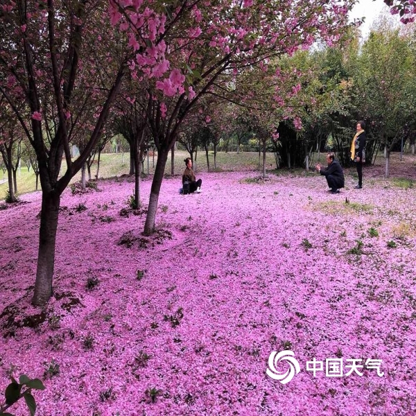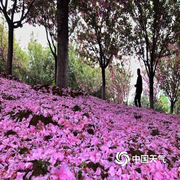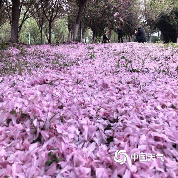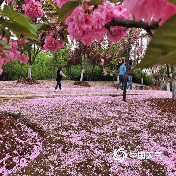 2019年04月11日 22:084月10日,安徽六安市中央公园里,市民在落樱缤纷的樱花树下赏花。受4月9日大风降雨天气影响,六安市区中央公园里正值盛花期的樱花落满草坪,如同一层浅浅的“花毯”,美不胜收。(摄/田凯平)
