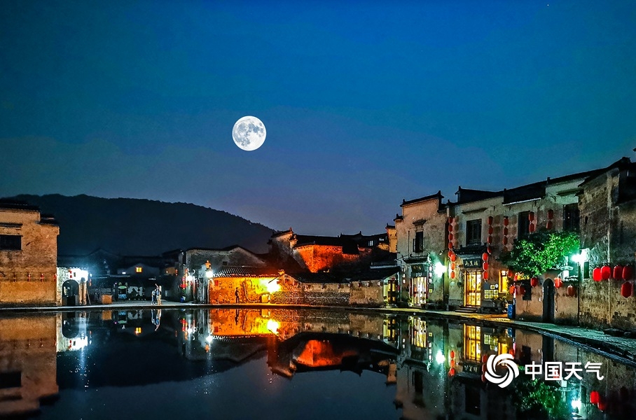 中秋佳节,一轮圆月高挂在徽州,照亮了层层叠叠的马头墙,与西递牌坊、宏村月沼交相呼应,一幅人间美景呈现在游客面前。(摄/程大亮)