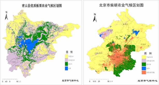 农业气候区划根据任务特点可分为综合农业气候区划和专题农业气候区划两类。近年来,北京市气候中心根据气候学原理结合经度、纬度、高程、坡向、坡度和开阔度等地形因子建立了细网格光、温、水等气候要素值的统计学方程,进而推算出网格点上的气候要素值。同时,在对特色农作物生物气象指标广泛调研的基础上结合细网格气候资源数据进行了七个山区县试点名优品种水果专题农业气候区划(苹果、板栗、磨盘柿、樱桃、葡萄和大桃等)和特色中药材专题农业气候区划(西洋参、柴胡、甘草、板蓝根和黄芩等)。这些区划成果在指导区县农业种植结构调整和合理地利用气候资源方面都发挥了非常重要的作用。