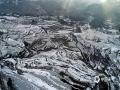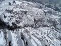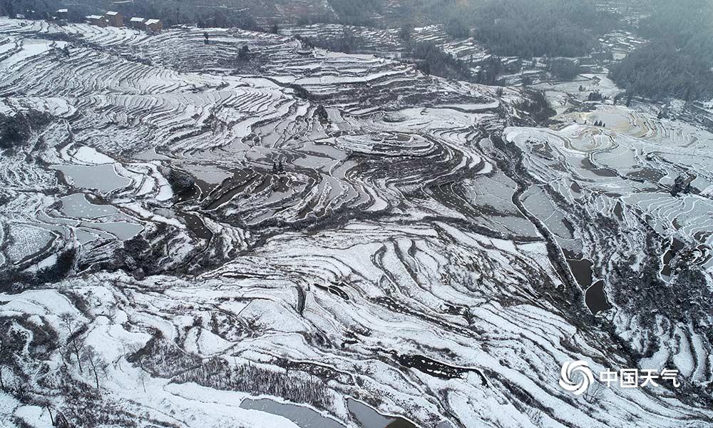 2018年12月31日,重庆市酉阳土家族苗族自治县花田乡何家岩村的梯田被白雪覆盖,从空中俯瞰雪中梯田,美如水墨画。(陈碧生/摄)