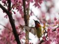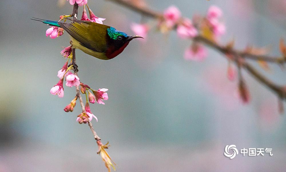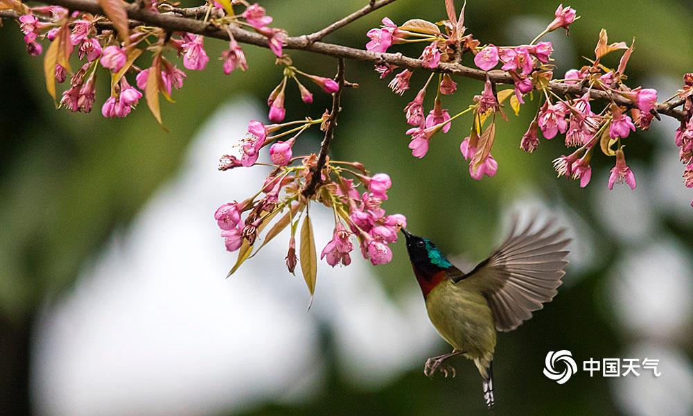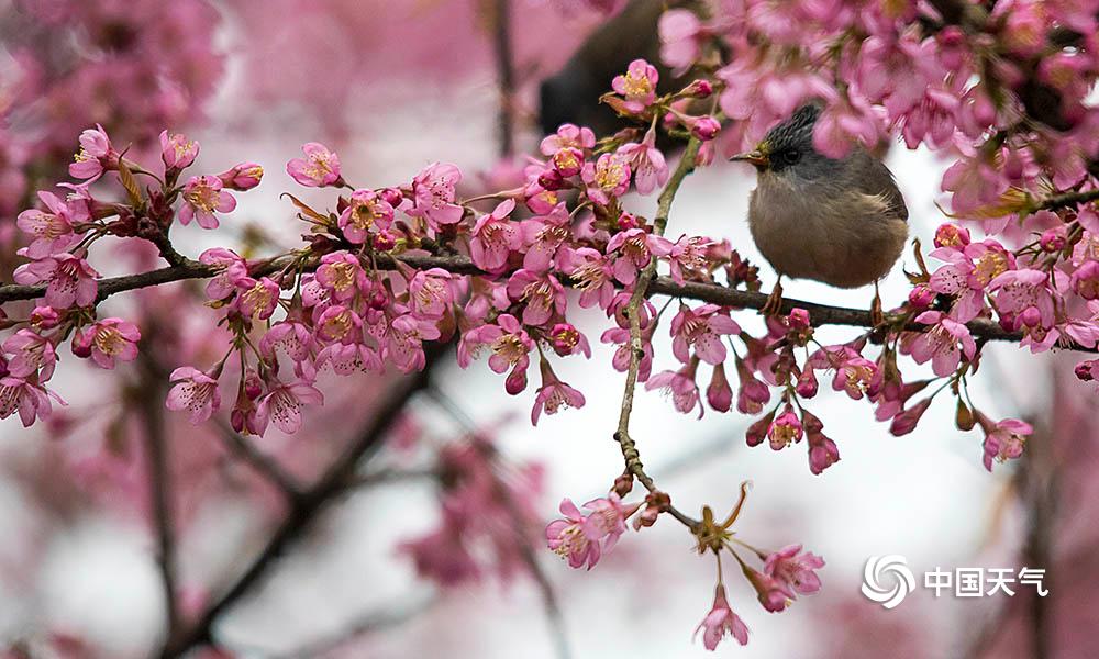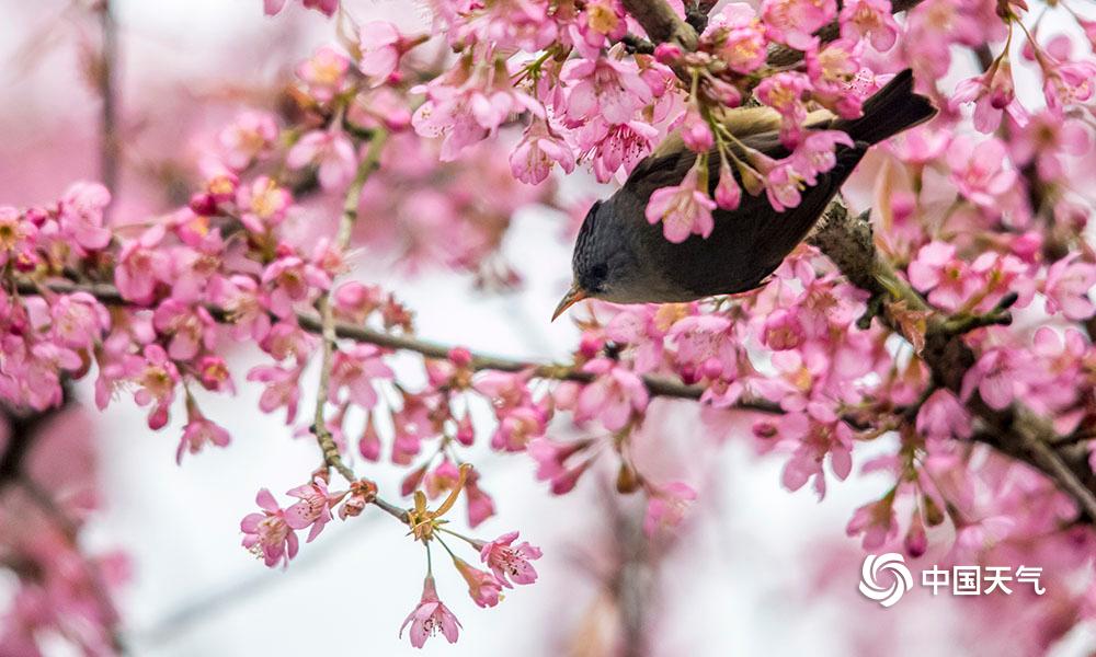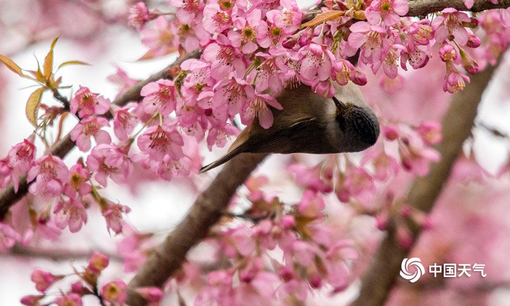 中国天气网讯 1月23日,重庆南山植物园内种植的樱花娇艳绽放,鸟儿穿梭其间一边觅食一边嬉闹,仿佛是在吟唱着:“春来到”!(凌舸智/摄)