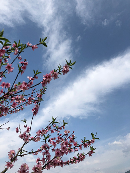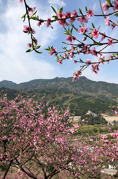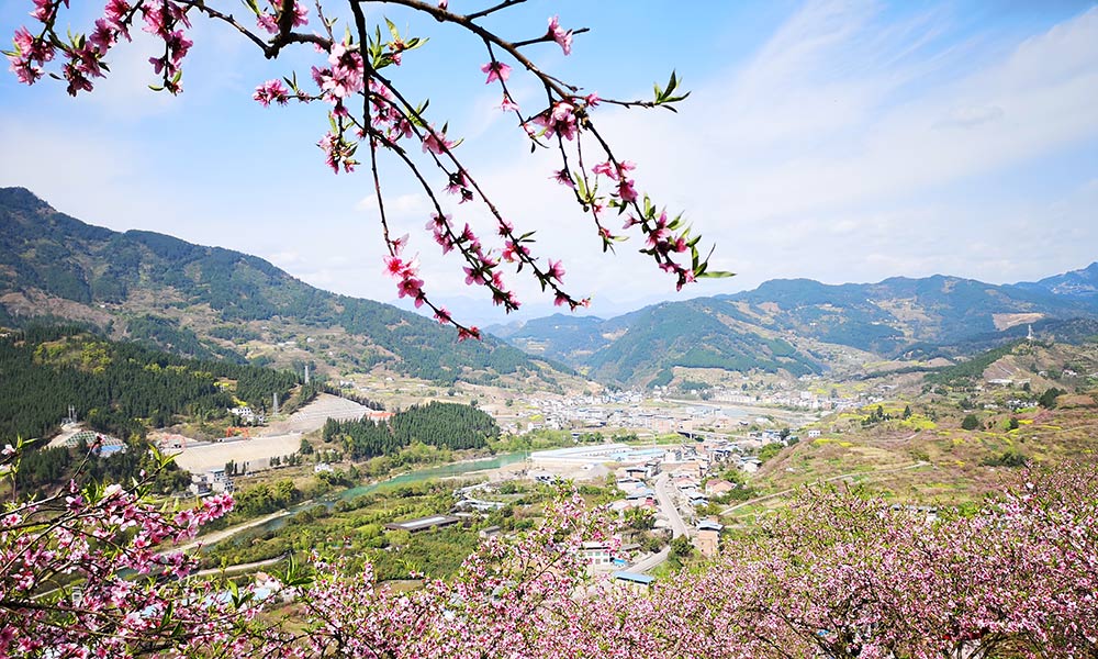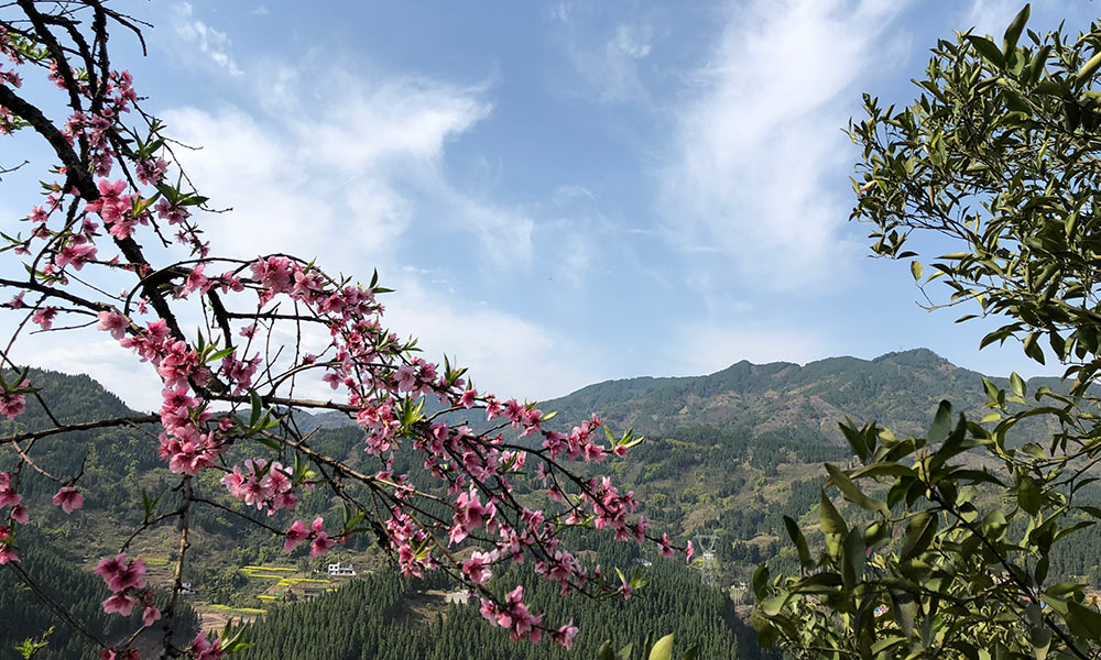 3月14日,重庆开州郭家镇万亩桃花在高山下绽放成海,在蓝天白云下显得格外美丽。(文 韩世刚 图 王文芳 刘寿文)