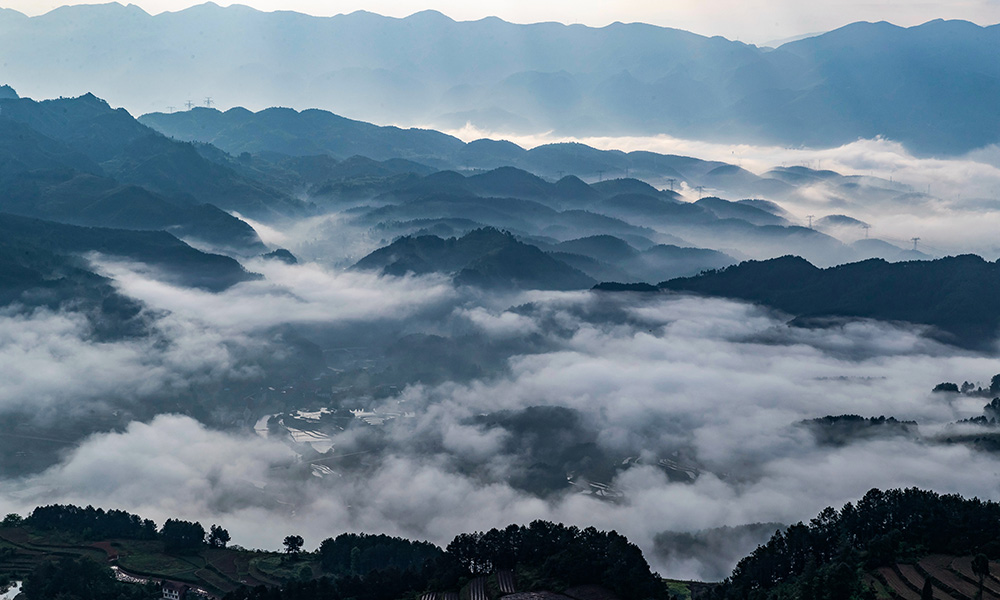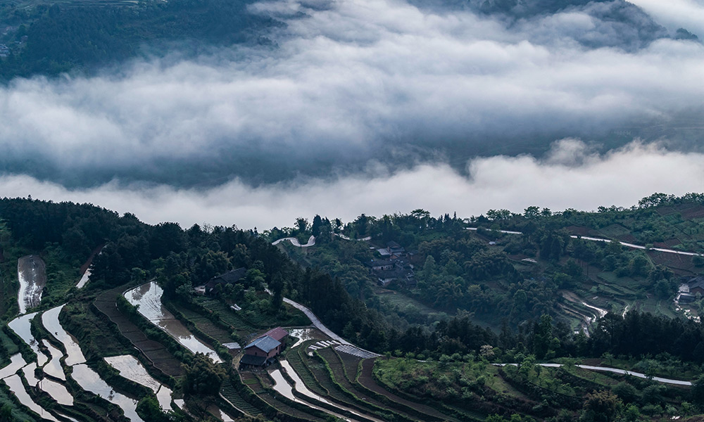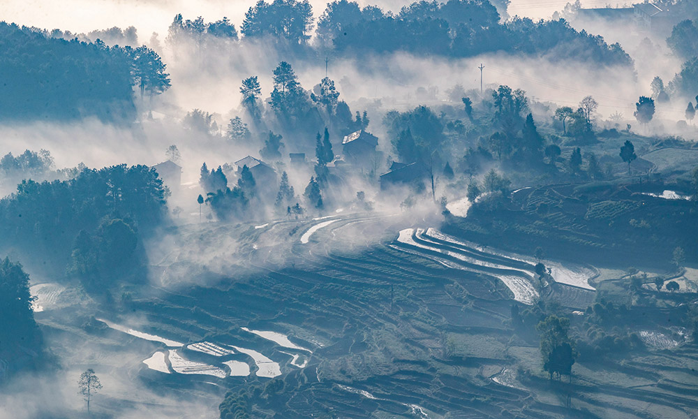 清明、谷雨过后,昼晴夜雨温差大,重庆市南川区山涧河谷、平坝地区时常出现平流雾,在淡淡的晨雾笼罩下,农房、田野、河流、公路若隐若现,宛如人间仙境。(摄影:瞿明斌)