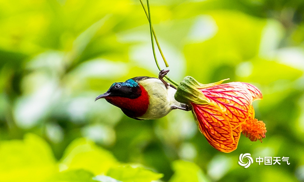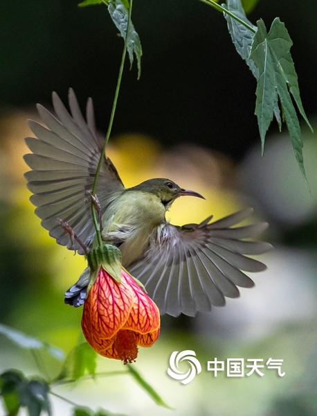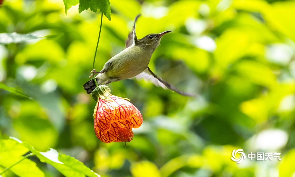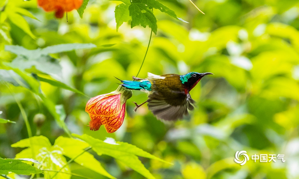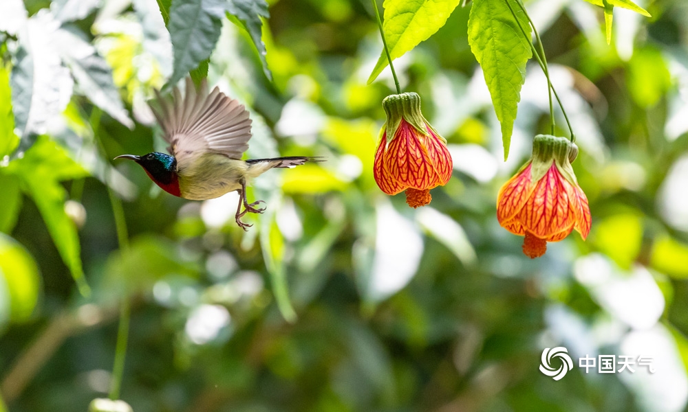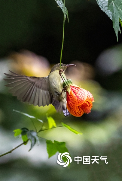 2019年5月26日,一只飞舞在花间吸食花蕊汁的叉尾太阳鸟。
