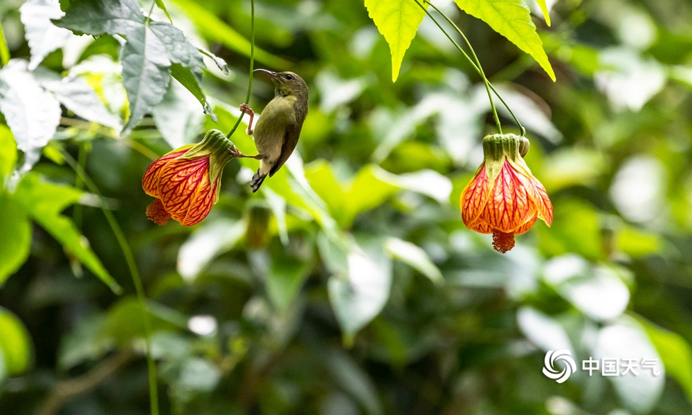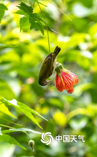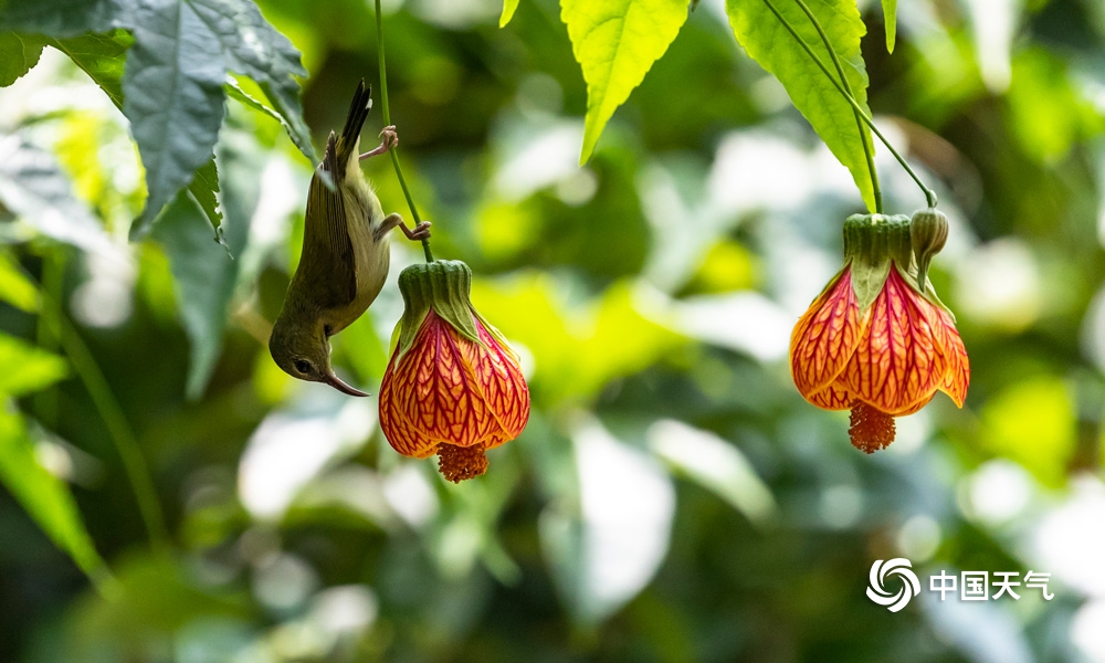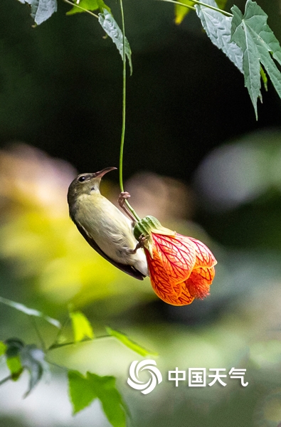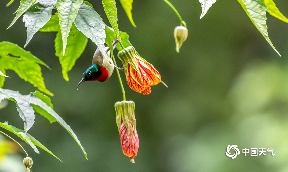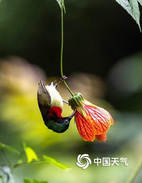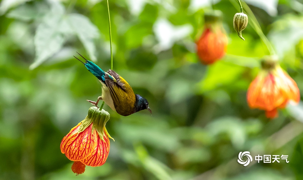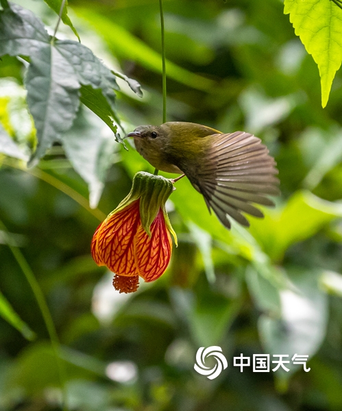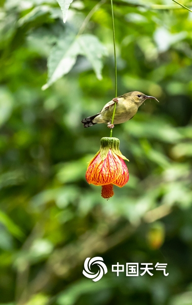当日,在金佛山北坡景区,叉尾太阳鸟飞舞在花间,摆出各种窘态吸食刚刚开放的灯笼花花蕊汁。(瞿明斌/图文)