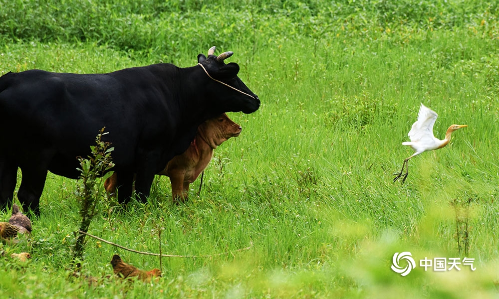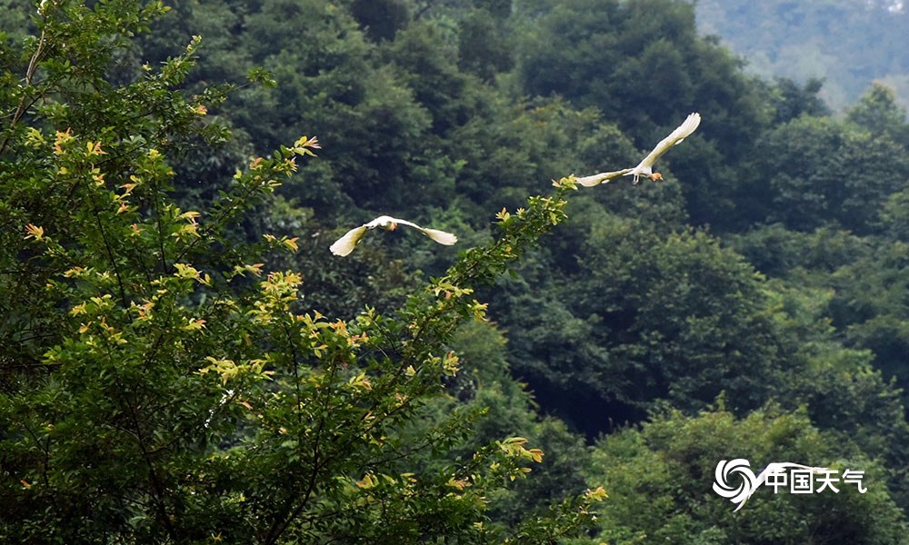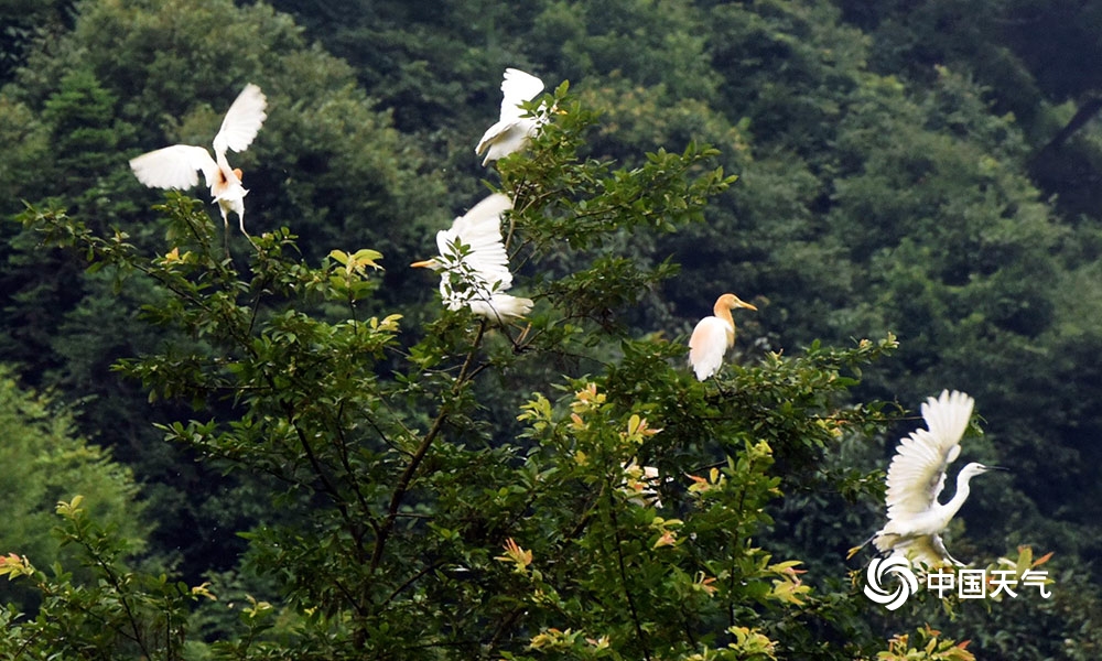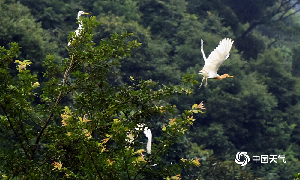 中国天气网讯 6月25日,在重庆市酉阳土家族苗族自治县麻旺镇米旺村看到,成群的白鹭在河道两旁树上捉迷藏,在湿地里面戏水而且还和牛儿觅食。(陈碧生 文/图)