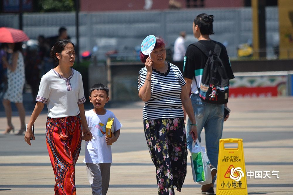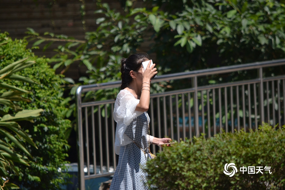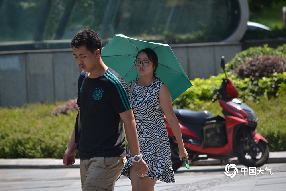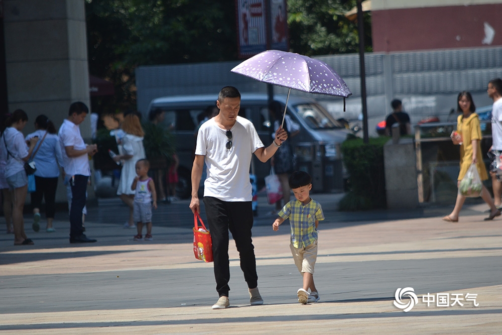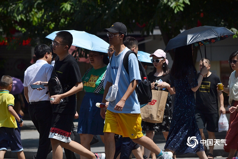 中国天气网讯 昨日(28日)重庆各地晴间多云,重庆奉节、开州和渝北等19个区县最高气温超37℃,主城沙坪坝区最高温达38.7℃,全市奉节最高达41.1℃,高温天里市民出行如“烤肉”。据市气象台预计,未来三天重庆“高烧”持续,还请市民朋友注意防暑降温。图为重庆市渝中区高温天里出行的市民。(图/阮文鑫)