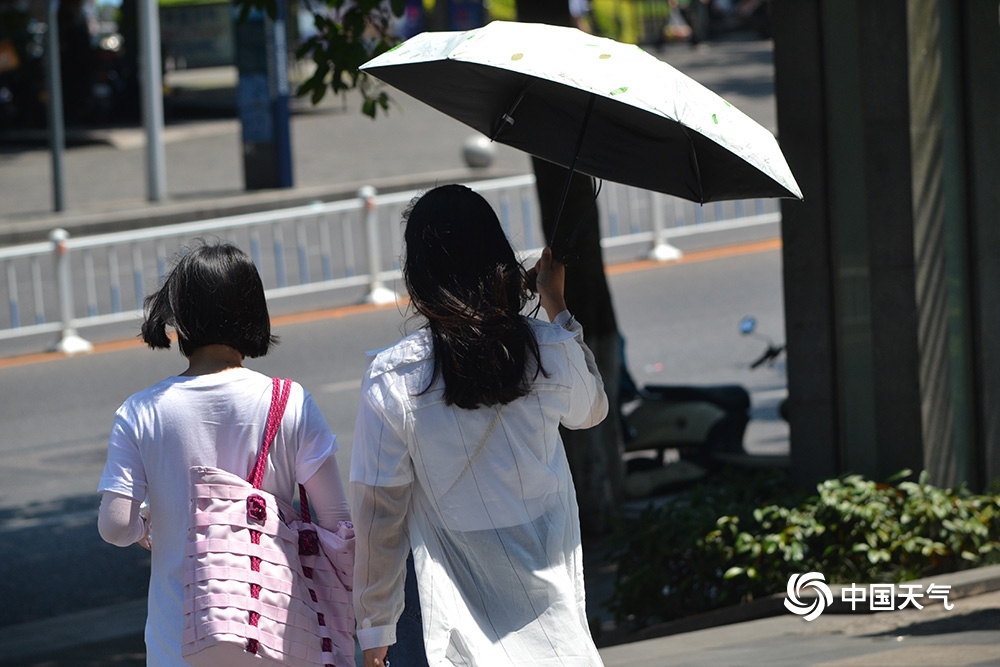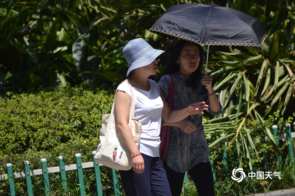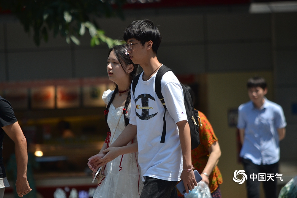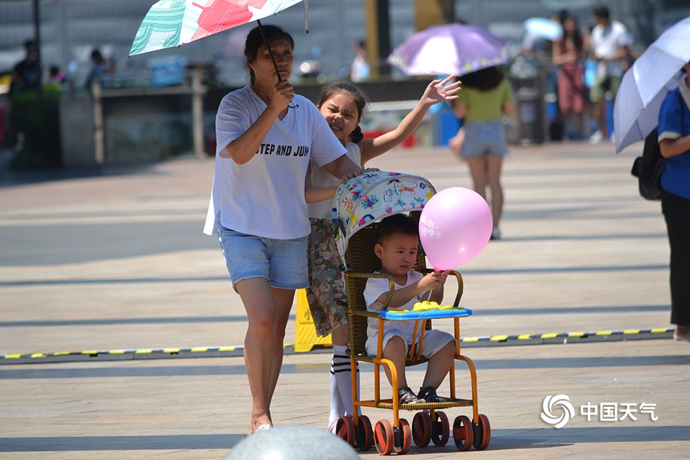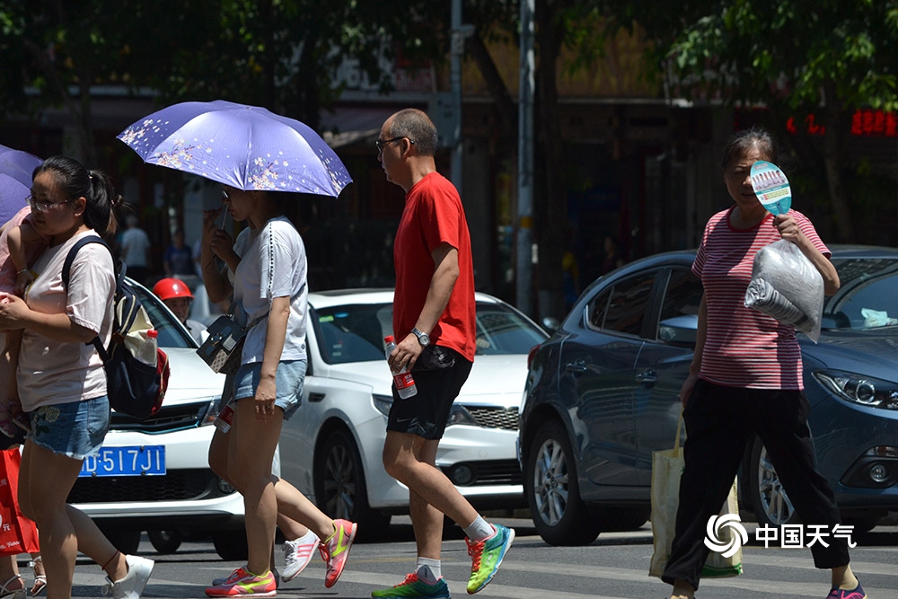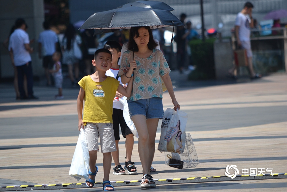 中国天气网讯 昨日(28日)重庆各地晴间多云,重庆奉节、开州和渝北等19个区县最高气温超37℃,主城沙坪坝区最高温达38.7℃,全市奉节最高达41.1℃,高温天里市民出行如“烤肉”。据市气象台预计,未来三天重庆“高烧”持续,还请市民朋友注意防暑降温。图为重庆市渝中区高温天里出行的市民。(图/阮文鑫)