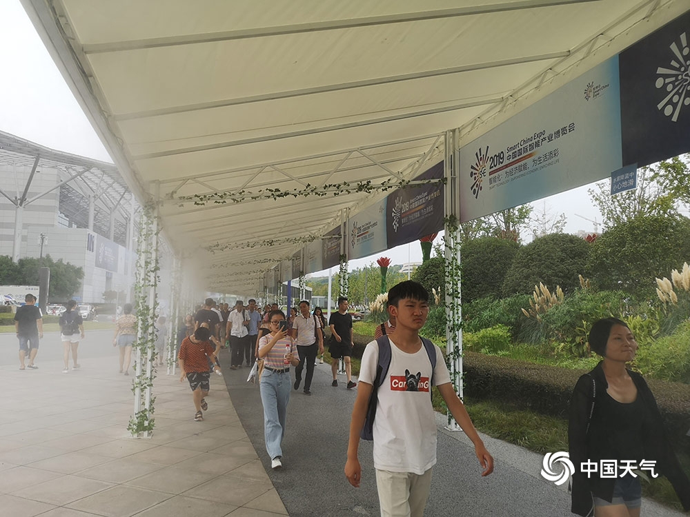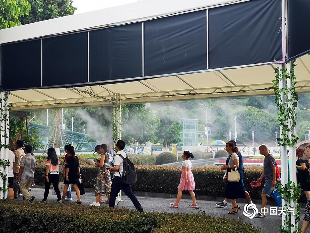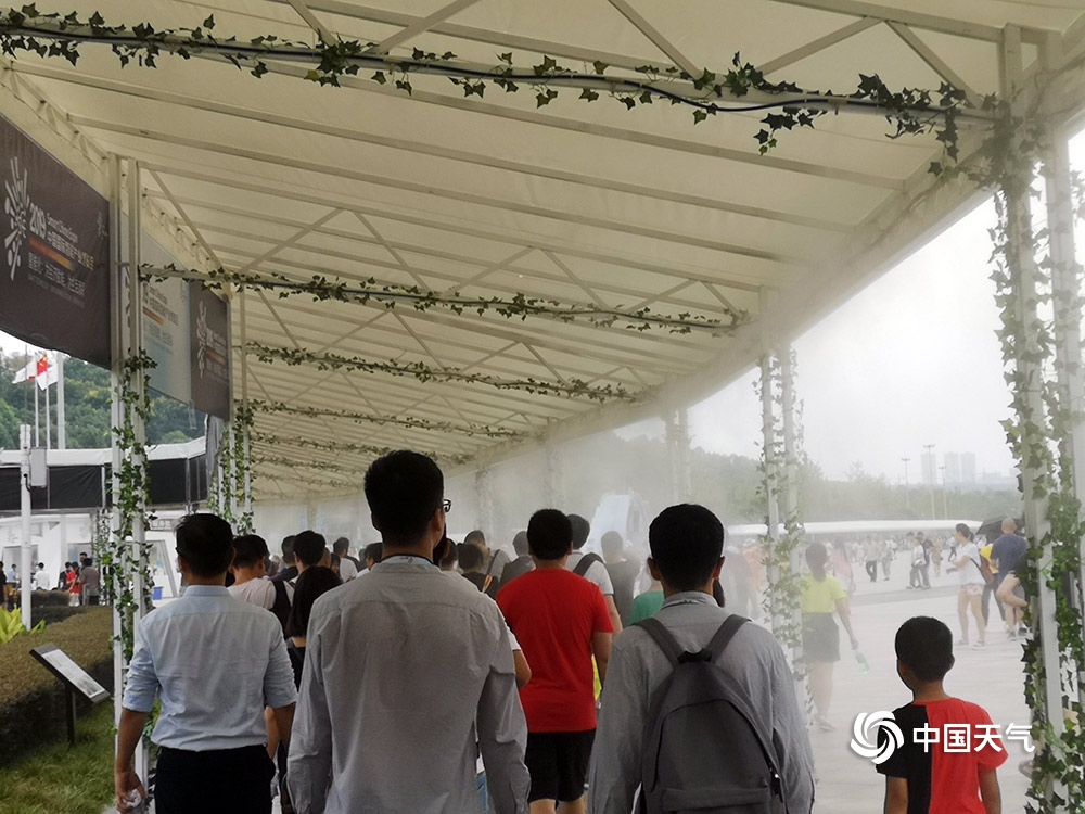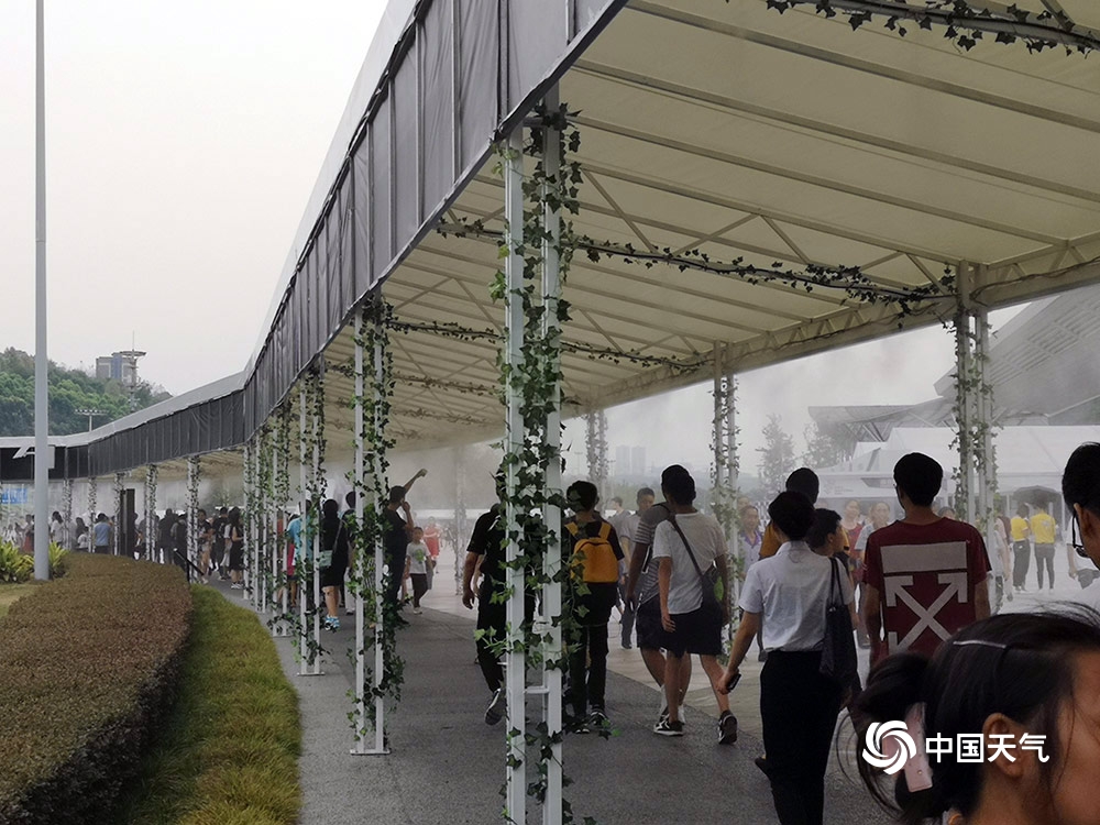 中国天气网讯 昨天(27日)是普通观众参观智博会首日,重庆主城最高气温达到36.4℃。通往智博会场馆一条长约十几米的长廊上,几十个喷雾同时开放为市民降温,仙气十足。图为市民走在喷雾长廊上。