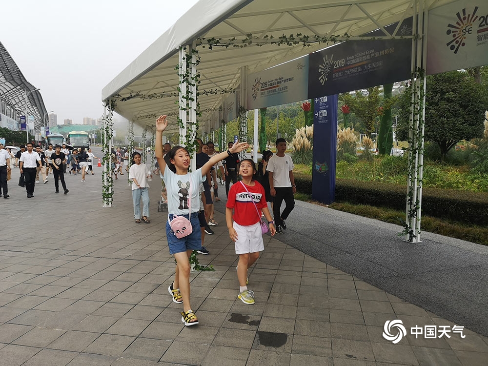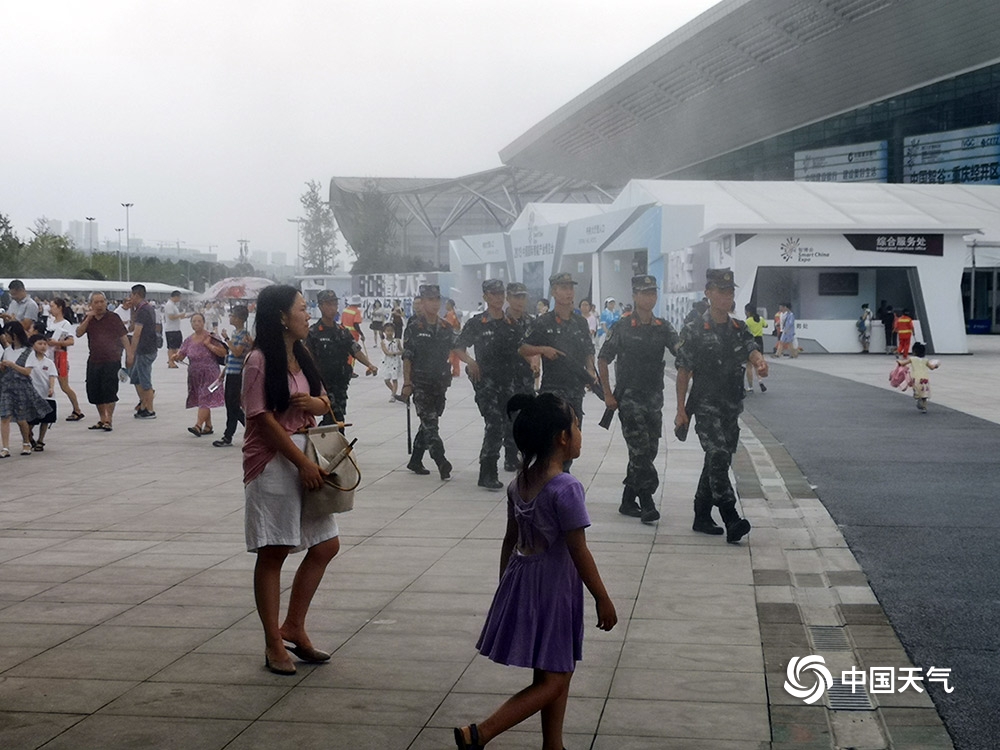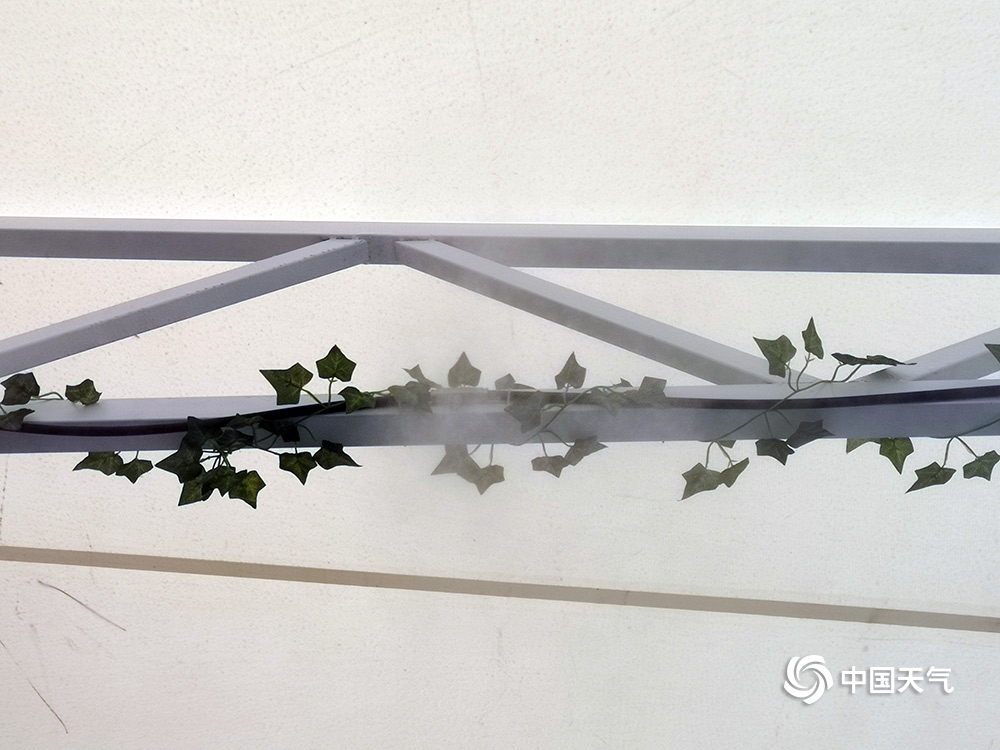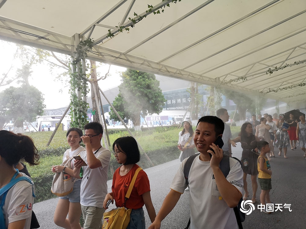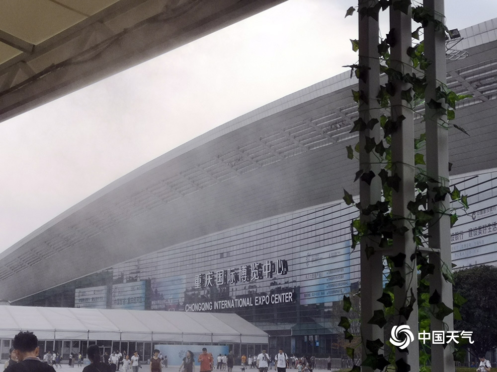 中国天气网讯 昨天(27日)是普通观众参观智博会首日,重庆主城最高气温达到36.4℃。通往智博会场馆一条长约十几米的长廊上,几十个喷雾同时开放为市民降温,仙气十足。图为市民走在喷雾长廊上。
