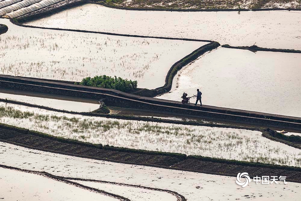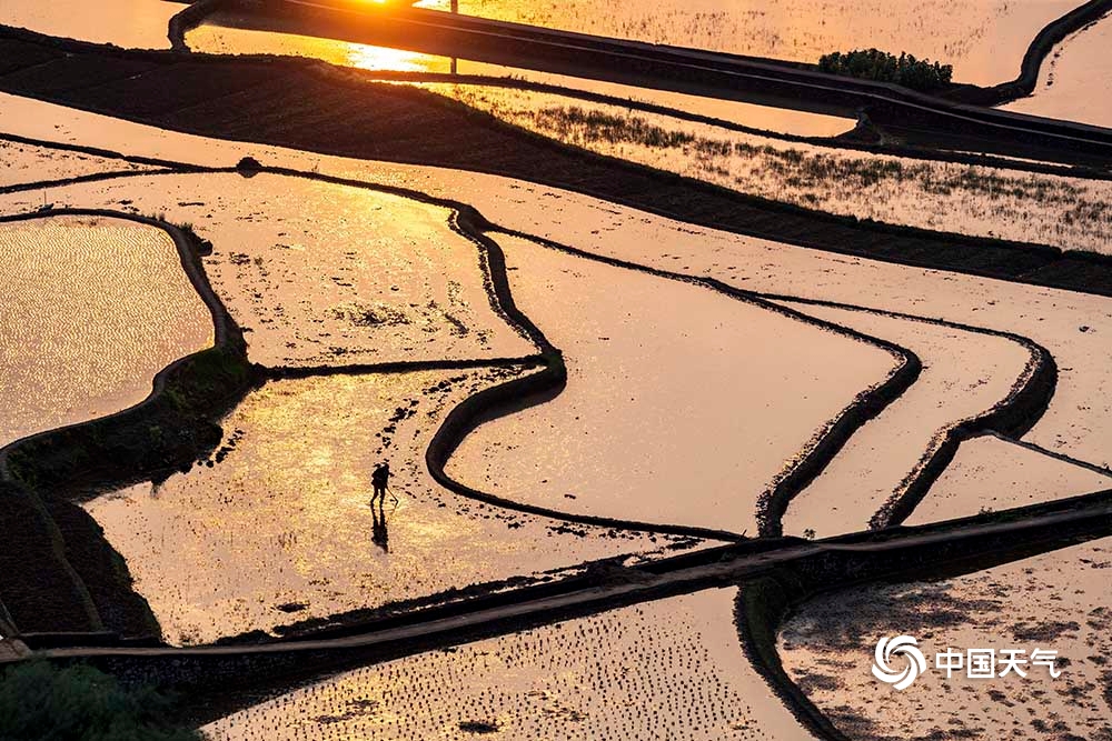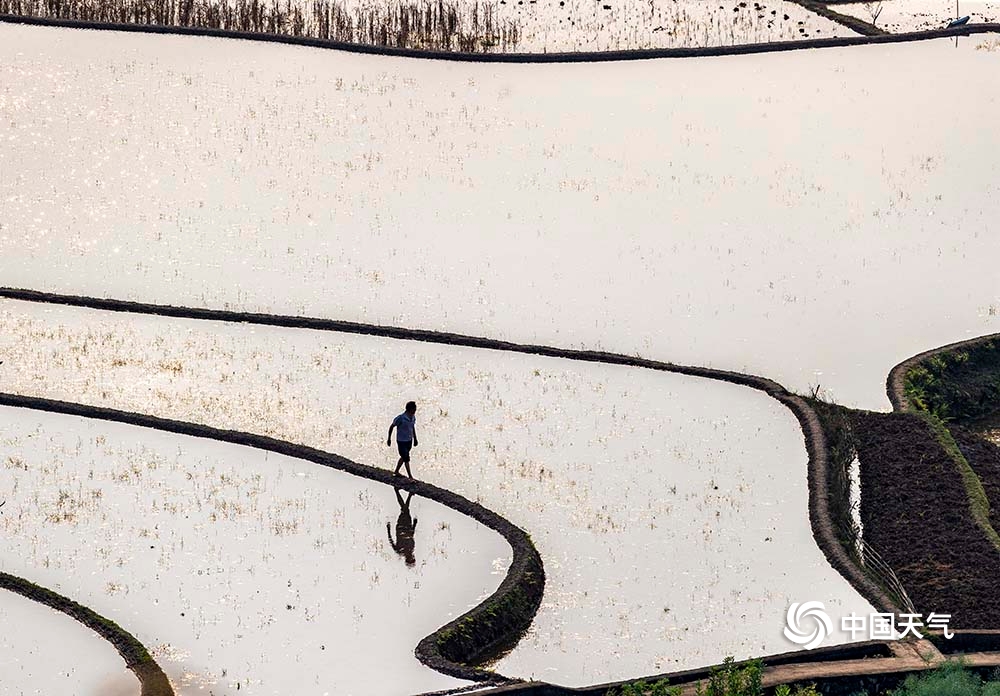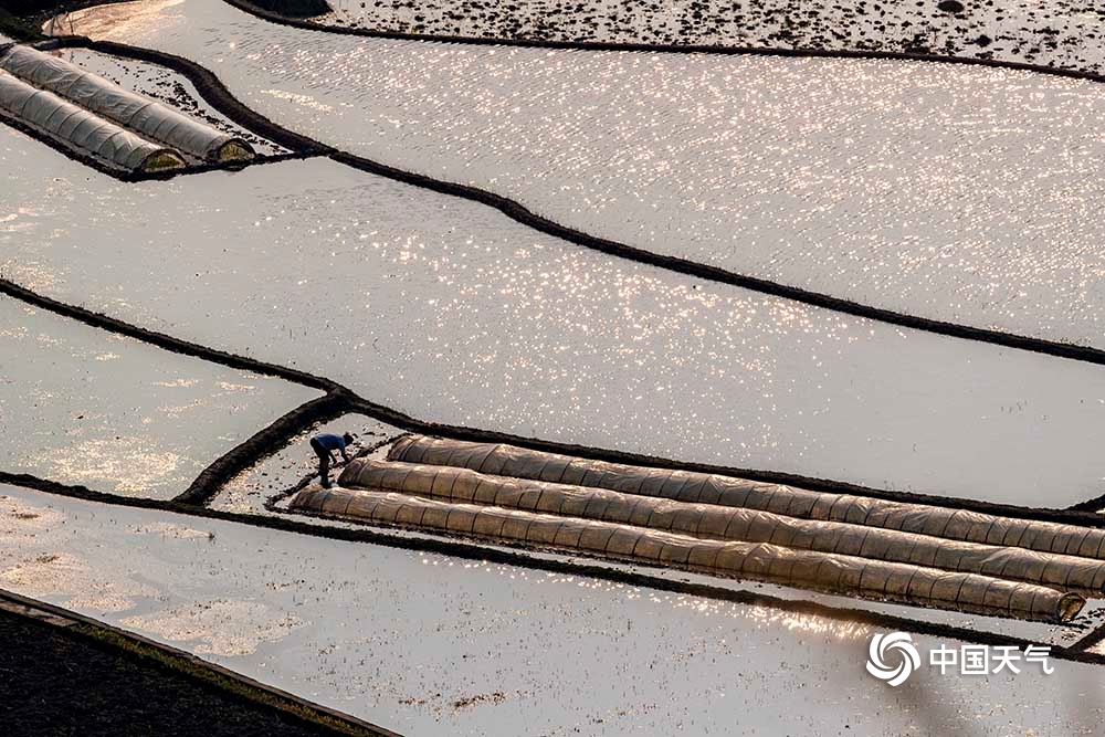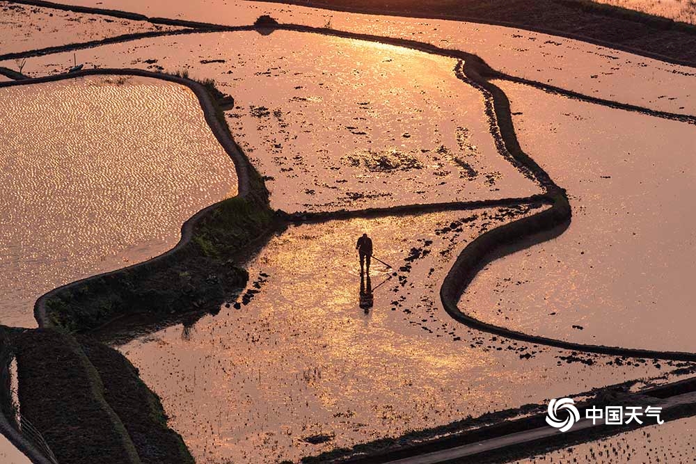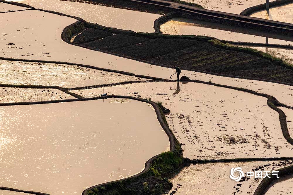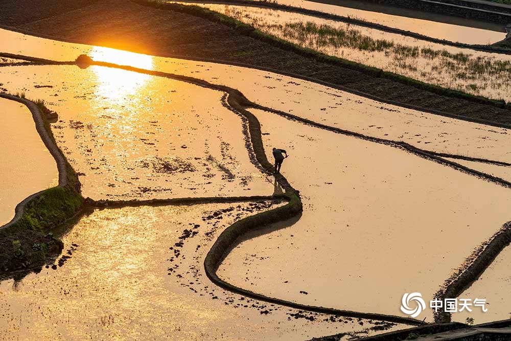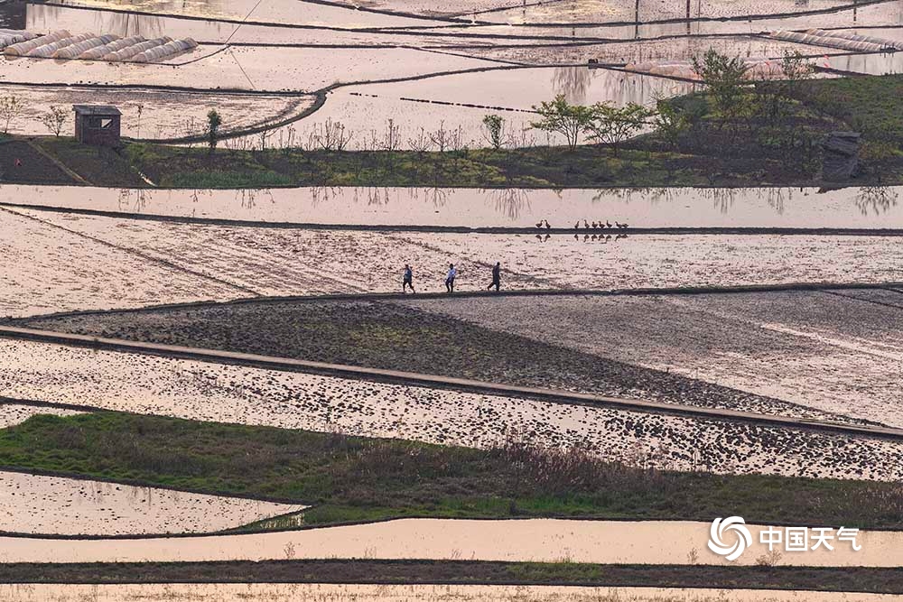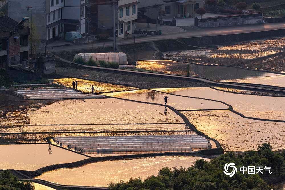 中国天气网讯 3月26日,南川区南城街道清泉社区村民抢抓时节整田蓄水,他们劳作或行走在田埂上的身影在夕阳的映照下,把山乡梯田绘成了一幅美丽的图画。(图/瞿明斌)