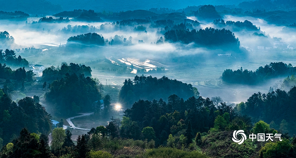 4月9日,位于重庆市南川区生态大观园境内的木凉、兴隆等乡镇经过春雨洗礼后,晨雾开始弥漫在山涧和村庄中,朦朦胧胧,仿佛走入世外桃源。(摄/瞿明斌)