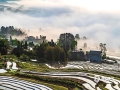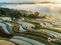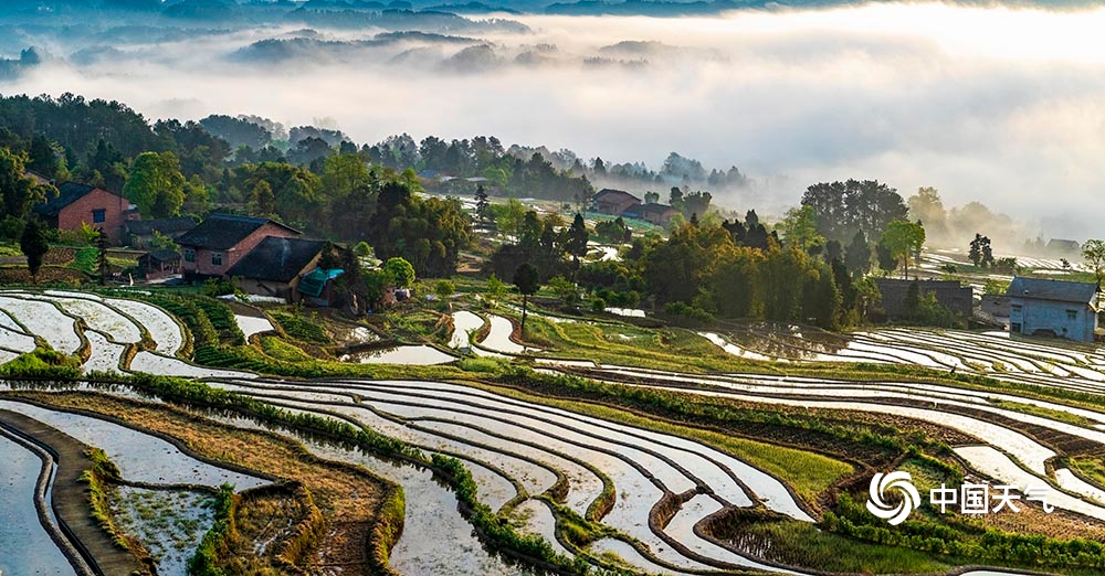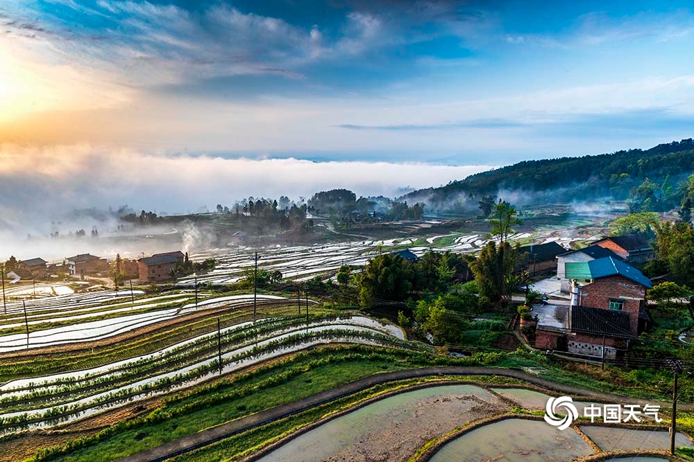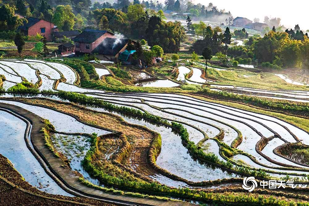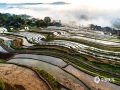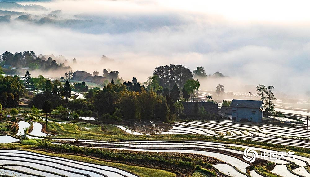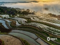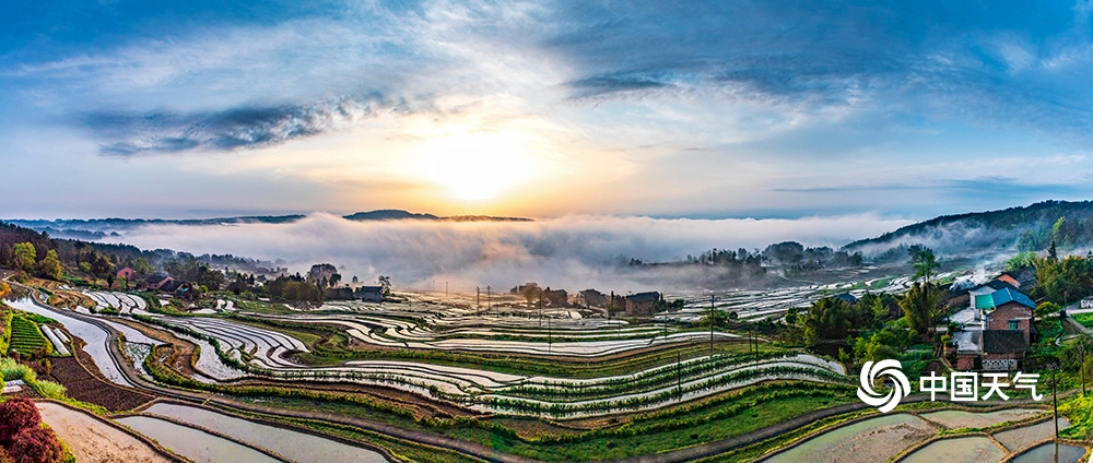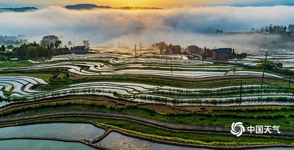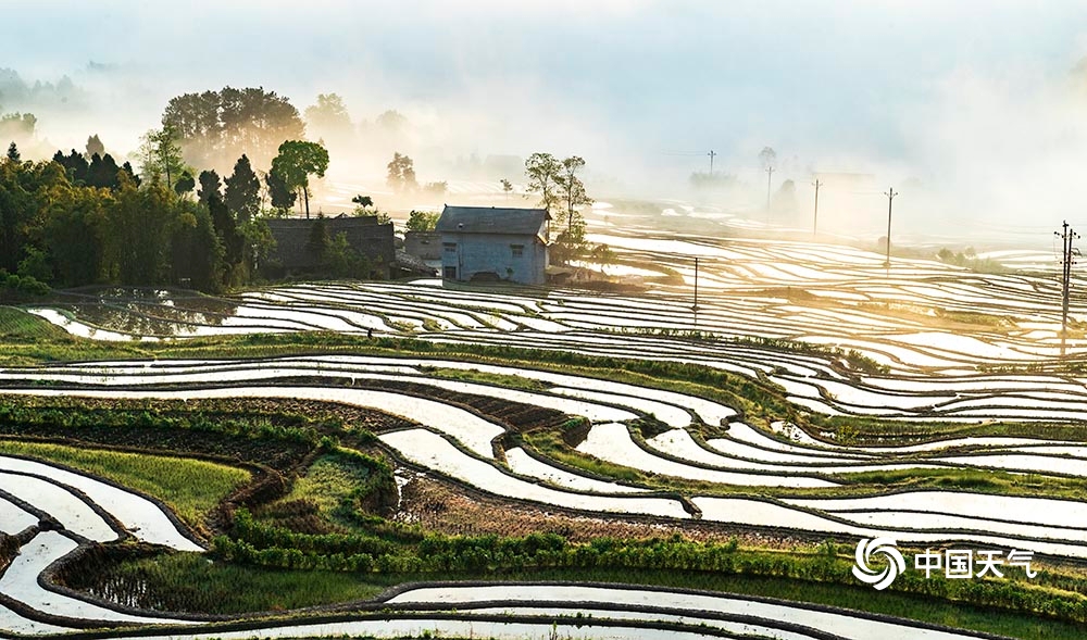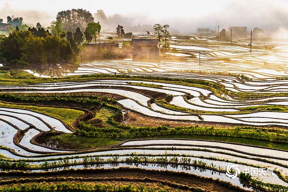 中国天气网讯 4月12日,重庆市南川区石溪镇盐井梯田,在晨曦的映照下,云蒸雾绕,波光粼粼,梯田曲线犹如一条条银丝带在山涧闪烁。此情此景下的盐井梯田,如同泼洒人间的水彩画,美到无法形容。(图/瞿明斌)