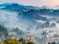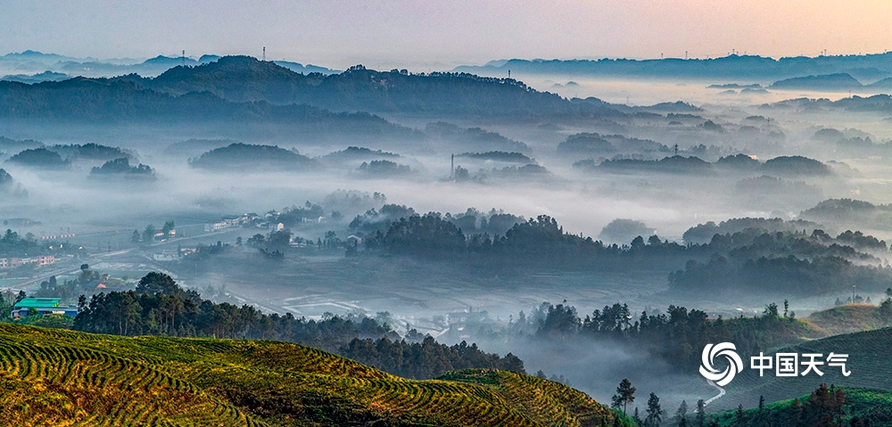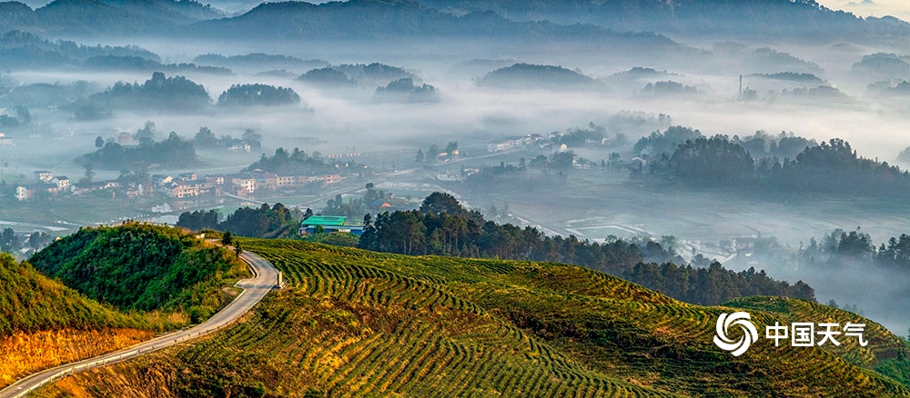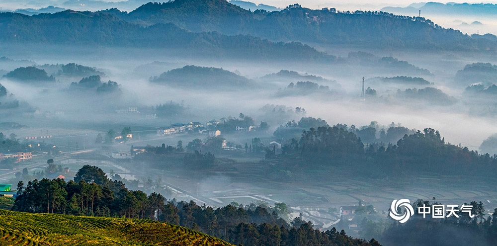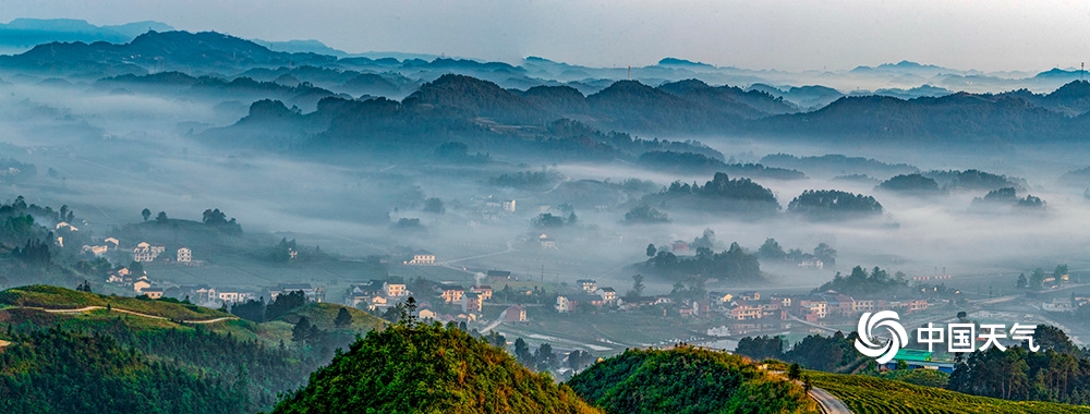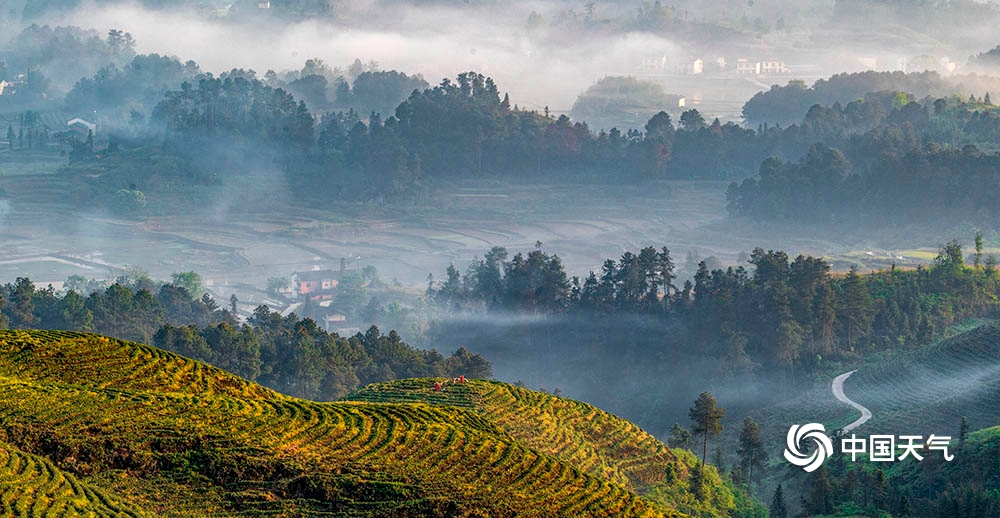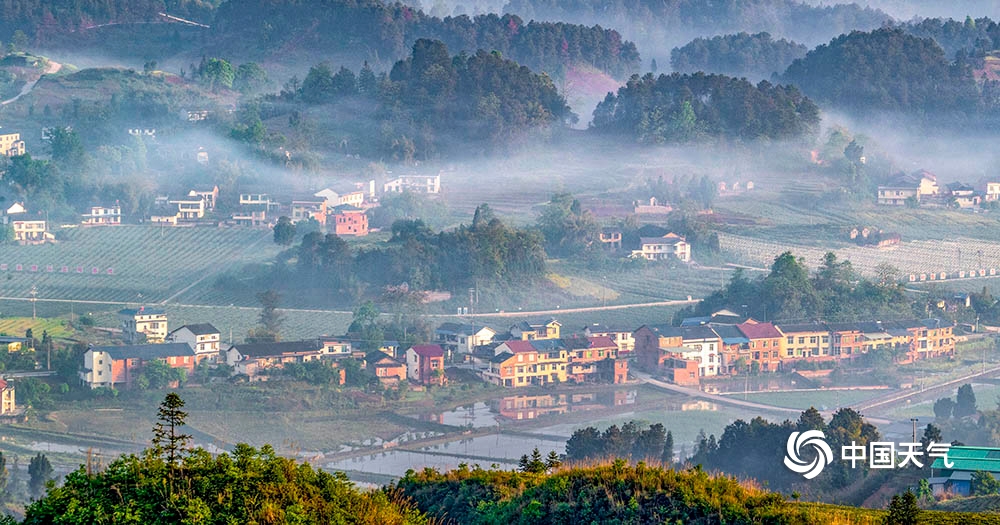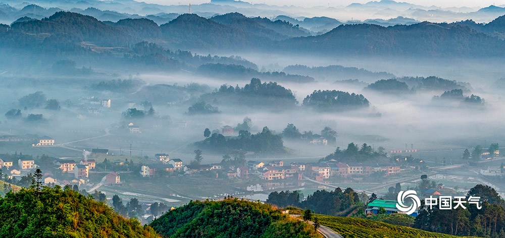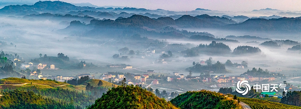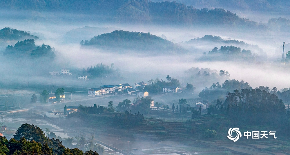 中国天气网讯 2020年4月26日,重庆市南川区山涧河谷出现平流雾,如纱的薄雾在起伏的山峦和农房间流淌漫舞,田园、森林、民居在晨雾中若隐若现,宛如一幅新山居图画。(瞿明斌/图文)