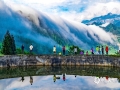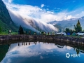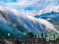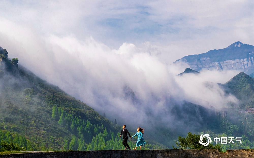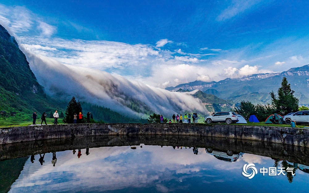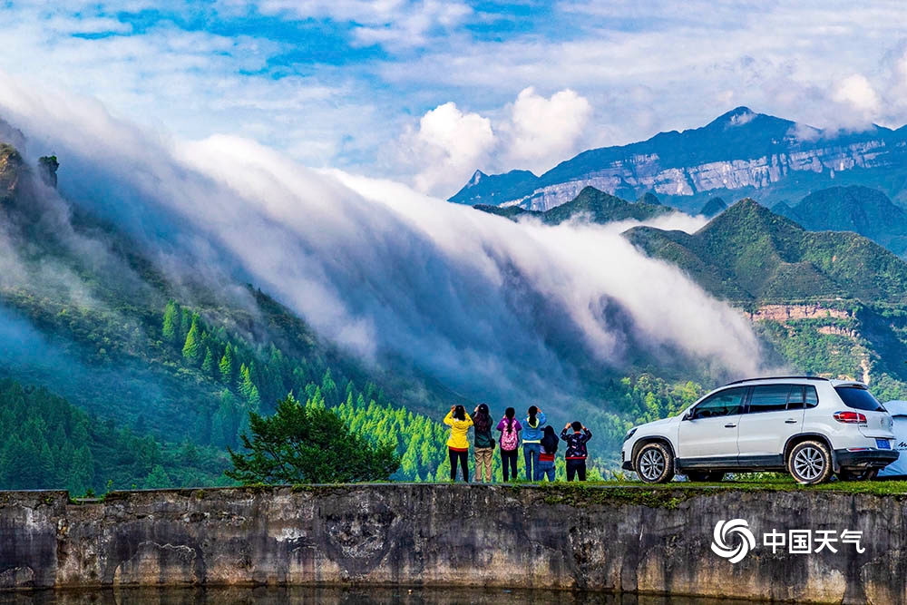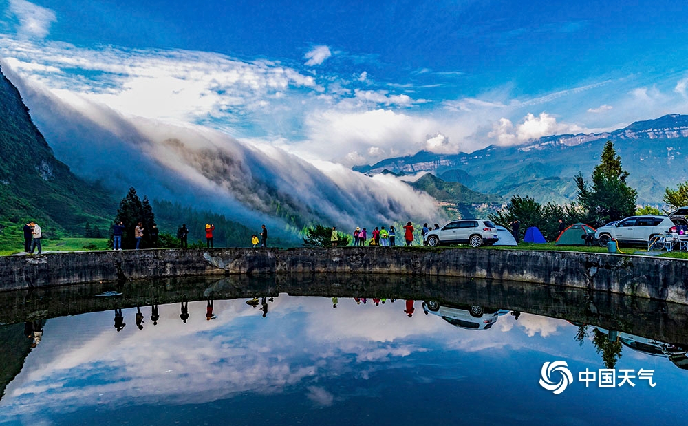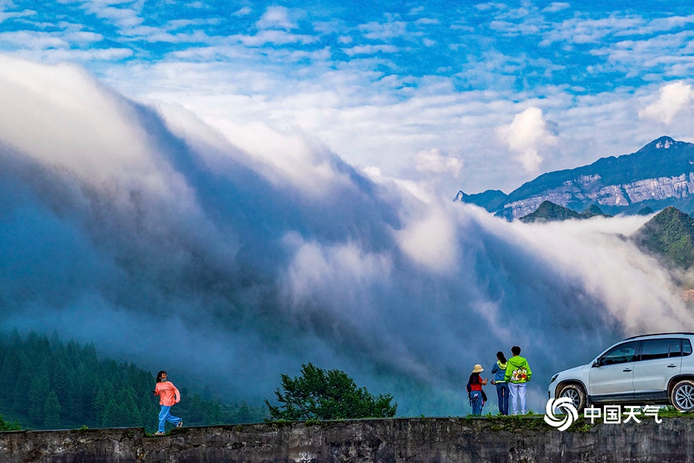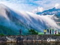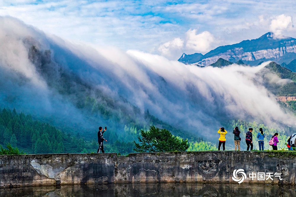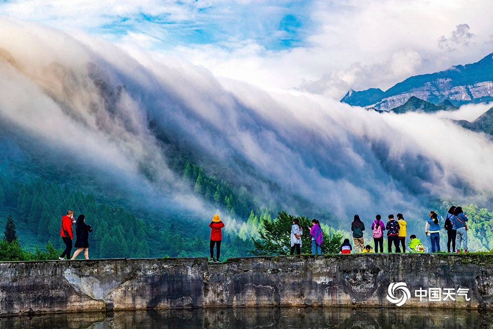 2020年5月1日,人们在重庆市南川区金佛山东麓观看云瀑景观。