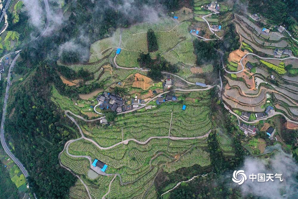 重庆市黔江区沙坝镇李园千树万树李花开,像春雪一样飘落在大山间,美不胜收。近日,当地出现阴雨天气,雨后山间云雾飘渺,像条条玉带缠绕着李园,美如仙境。吸引了众多游客冒雨赏花、踏青。