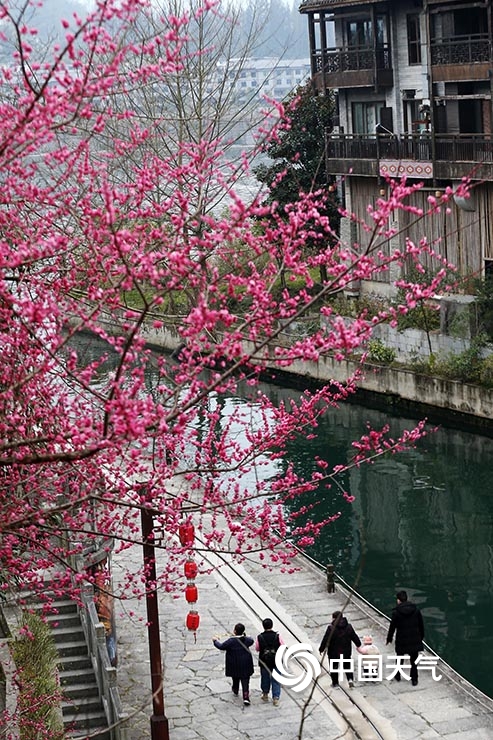 中国天气网讯 近日,重庆黔江濯水古镇的梅花盛开,梅花和吊脚楼互相映衬,游客仿佛在画中游玩。(杨敏/摄)
