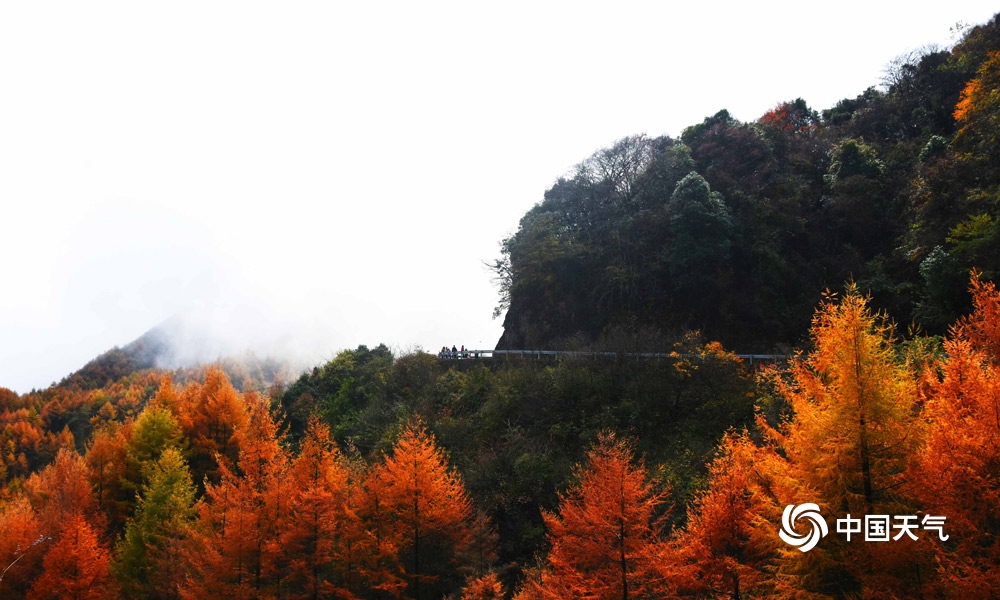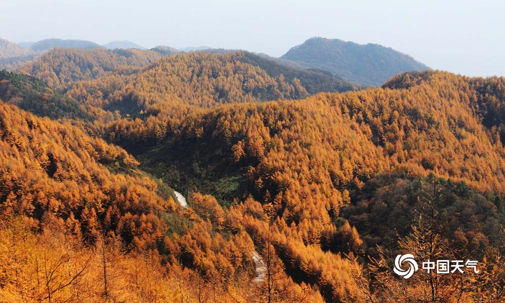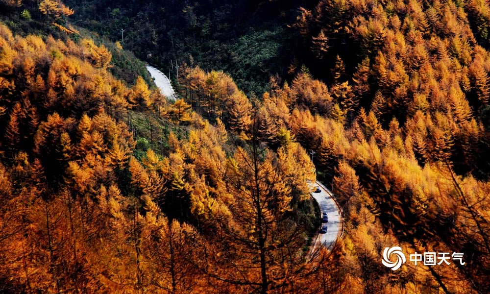 金秋时节,重庆市巫山县梨子坪森林公园,2万余亩落叶松换上了“金装”,山岭间层林尽染,宛如一幅色彩斑斓的油画,美不胜收。(王忠虎/摄)