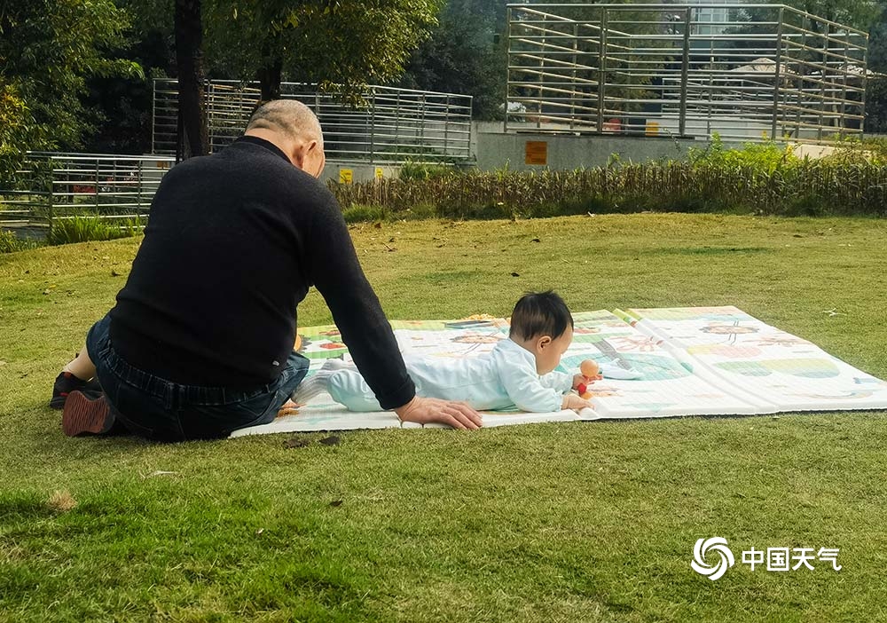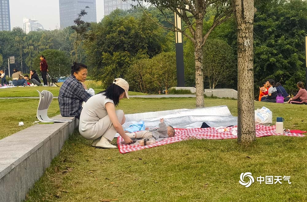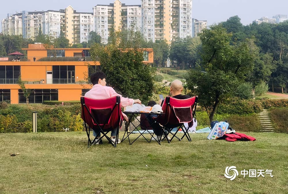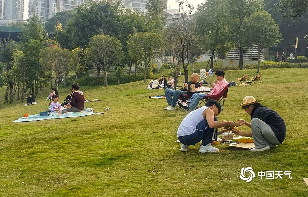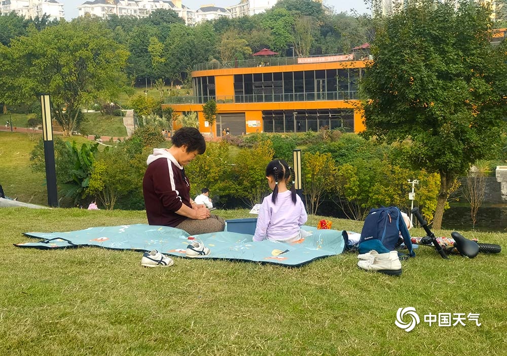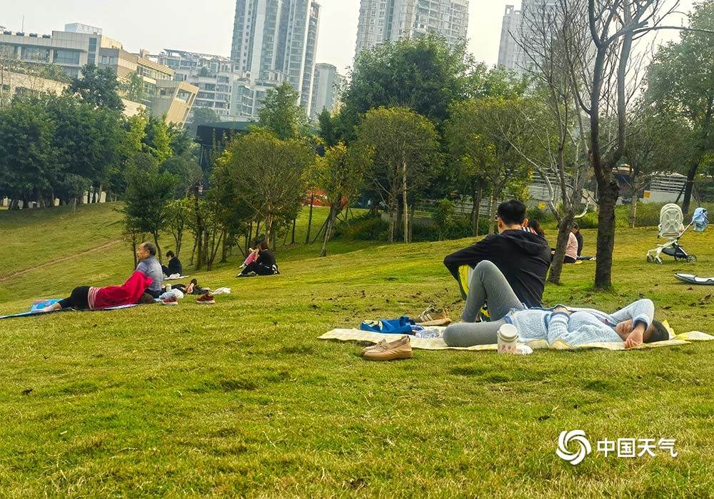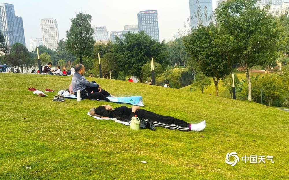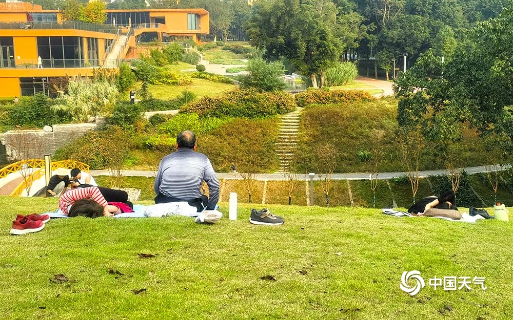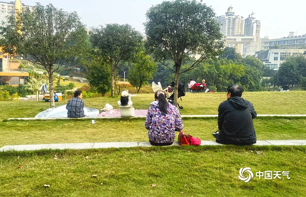 中国天气网讯 重庆市气象台预计,11月9日夜间到11月12日白天重庆将开启持续阴雨天气模式。面对11月9日白天最后的灿烂阳光,在渝北区动步公园内,市民扎堆晒起了太阳。他们在草坪上摆上了躺椅或是铺上了野餐布,有的在玩耍,有的在聊天,有的甚至在闭眼小憩,好不惬意。