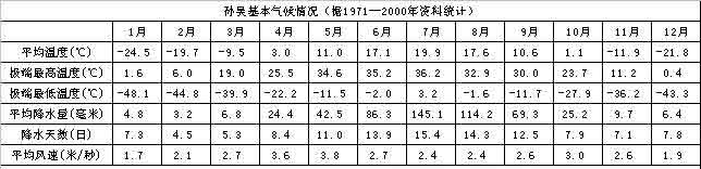黑龙江省孙吴县地处中国东北边陲,位于小兴安岭北麓,隔黑龙江与俄罗斯的康斯坦丁诺夫卡区相望,属寒温带湿润季风气候。具有早晚温差大,春季风大,夏季温和多雨,秋季凉爽,冬季较长的气候特点。总的气温较低,年平均-0.6℃;雨量较多,年平均降水量有540毫米左右;无霜期较短,为93─126天,但是日照时间长,平均年日照可达2500多小时。