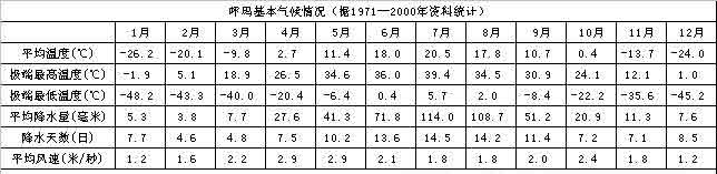 呼玛县属寒温带大陆性气候,冬季严寒而漫长,极端最代低气温-48.2℃,夏季炎热多雨且短暂,极端最高气温38℃,年平均气温-2℃。积雪覆盖期长达150余天,无霜期80至150余天。无霜期80至110天。年平均日照时数2529小时。年≥10℃的活动积温为1998.0℃。