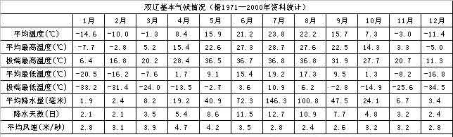 双辽市处于中温带亚湿润大区第二气候区,属大陆季风性气候。全年热量充足,光照充沛,降水一偏少,四季气候分明,雨热同步,能够满足一年一熟作物生长发育的需要,具有发展种植业的基本条件。春季升温快,干燥少雨,多大风天气。夏季温度高、炎热、降水集中,雨量充沛。秋季降温快,霜来的早,多晴好天气。冬季漫长,干燥寒冷少雪。年平均气温为5.8℃,一年中最大年温差为70℃,大于等于10℃的活动积温3118.6℃,无霜期145天,年日照2714.9小时,年降水量494.0毫米,干燥度1.23。