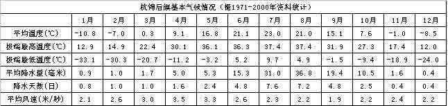 杭锦后旗是内蒙古自治区巴彦淖尔市七个旗县区之一,地形为西南高东北低,由西南向东北微度倾斜,属中温带干旱气候。年平均降雨量1 3 0mm左右,年平均气温7.2℃,无霜期1 3 0天左右,年日照时数3 2 2 0小时以上,日照率达7 3%,是全国光能资源最丰富的地区之一。黄河在全旗境内长1 7公里,是全国八大自流灌溉农区之一。