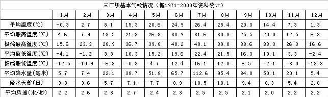 三门峡市地处我国的中原,位于黄河之滨,远离海洋,属于暖温带半干旱大陆性气候。这里常年的平均气温在14℃左右,一月最冷,平均气温-0.3℃,曾出现过的极端最低气温为-13℃;七月最热,平均气温26.4℃,曾出现过的极端最高气温达40℃。三门峡市多年平均的年降水量有560~630毫米,无霜期184~218天。最佳旅游时间为每年的春秋两季。