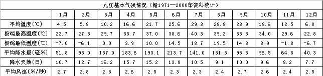 九江地处中亚热带向北亚热带过渡区,年平均气温16-17℃;年降雨量1300-1600毫米,其中40%以上集中在第二季度;年无霜期239-266天,年平均雾日在16天以下。
