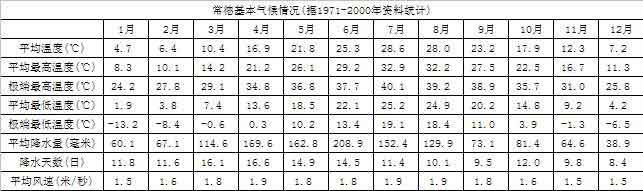 常德市属于中亚热带湿润季风气候向北亚热带湿润季风气候过渡的地带。气候温暖,四季分明,热量丰富,雨量丰沛,春温多变,夏季酷热,秋雨寒秋,冬季严寒。常德市年平均气温16.7℃,年降水量1200-1900毫米。