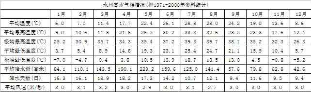 永州市位于湖南南部,南岭北麓,境内地形复杂,山地交错,气候复杂,属中亚热带湿润季风气候区,气温较高,严寒期短,春温多变,夏季多雨,夏秋多旱,光照充足,无霜期长,四季分明。气候要素时空分布不均,山区高差悬殊,立体气候明显,水热分布差异大,局部小气候复杂。 年平均气温在18℃左右,南部相对高于北部,年最高气温出现在7月底至8月,极端最高气温大部分地方可达39℃以上;最低气温一般出现在1月初至2月底。永州市的年降水量有1400毫米左右,主要集中在春夏两季,大部分地区春多于夏,秋多于冬,降水最大的月份在4月或6月,最少在1月或2月。