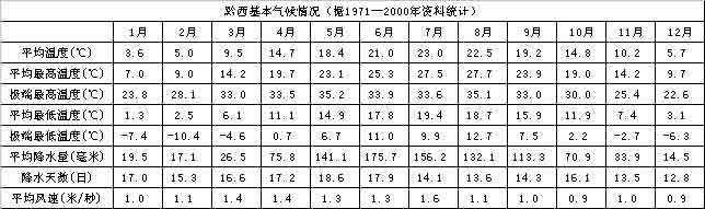 黔西,平均海拔1250米,年平均气温13.8℃,最低月平均气温3.3℃(1月),最高月平均气温23℃(7月),极端最高气温35.4℃,年平均降雨量1050毫米。冬无严寒,夏无酷暑。盛产烤烟、油菜、水稻、中药材等作物,适于大牲畜及家禽养殖。是发展果蔬、中药材种植、农产品加工的理想之地。