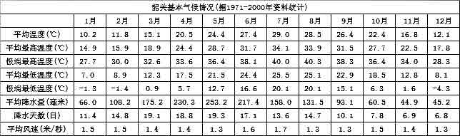 韶关属中亚热带湿润型季风气候区,气候温暖,年平均气温为18.8-21.6度;雨量充沛,年降雨为1300-2400毫米;全年无霜冻期为310天左右。