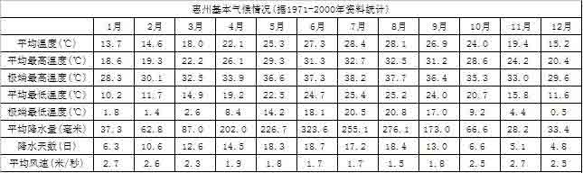 惠州市地处低纬度,北回归线横贯全市,属亚热带季风性湿润气候区,雨量充沛,阳光充足,气候温和。常年平均年降水量有1770毫米,主要集中在4月份至9月份,年平均气温22℃,无霜期长达350多天。充沛的降水,无霜期长,充足的日照量,使惠州多数地方的农作物普遍达到一年一两熟,某些区域甚至达到一年三熟。
