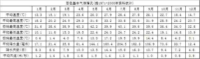 百色气候属亚热带季风气候,光热充沛,雨热同季,夏长冬短。百色年平均气温19.0°C 至22.1°C ,冬无严寒,夏无酷暑,草经冬而不枯,花非春而怒放。