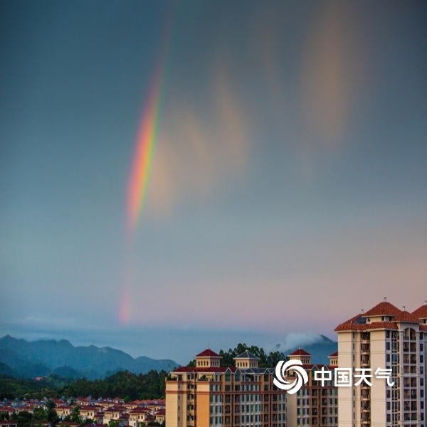 中国天气网讯 昨天(5日)傍晚,随着降雨减弱,广东省云浮市新兴县上空出现一道彩虹。绚丽的色彩点缀雨后的天空,并同天空形成鲜明对比。图片拍摄于新兴县新城镇。(图/李雪柏 文/李玖达)
