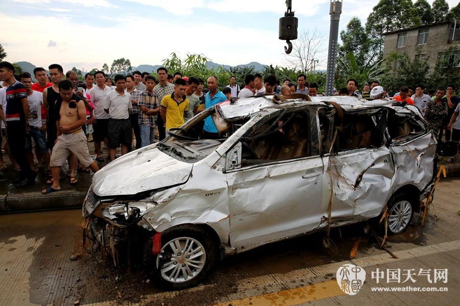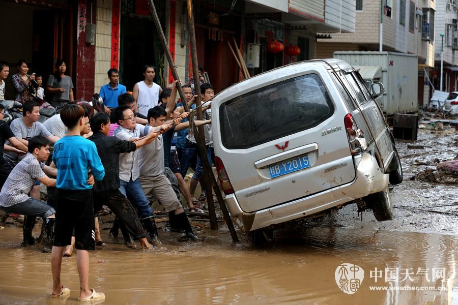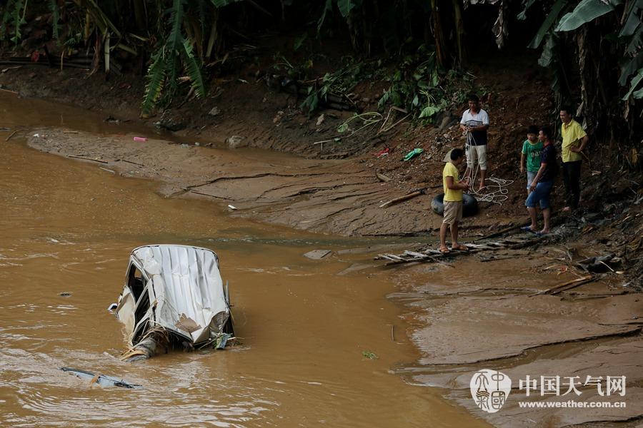 居民们正查看陷入淤泥里的小车(摄影:刘英轶)