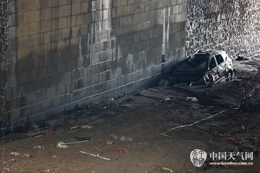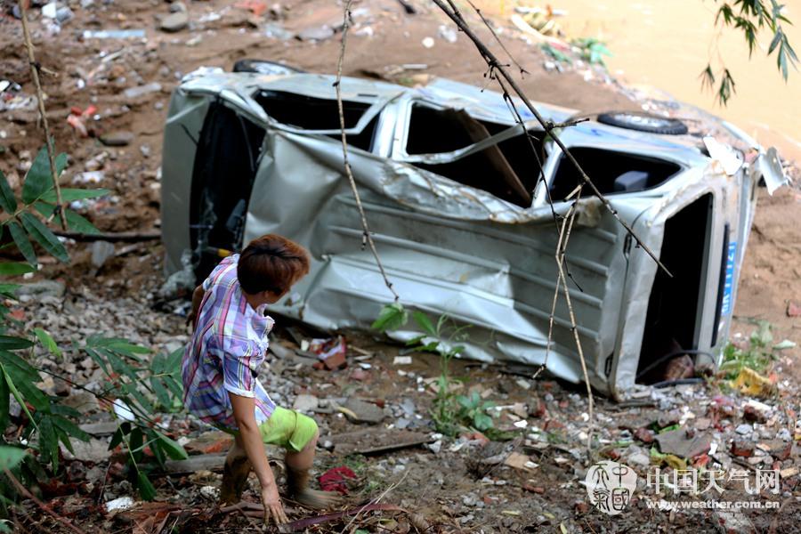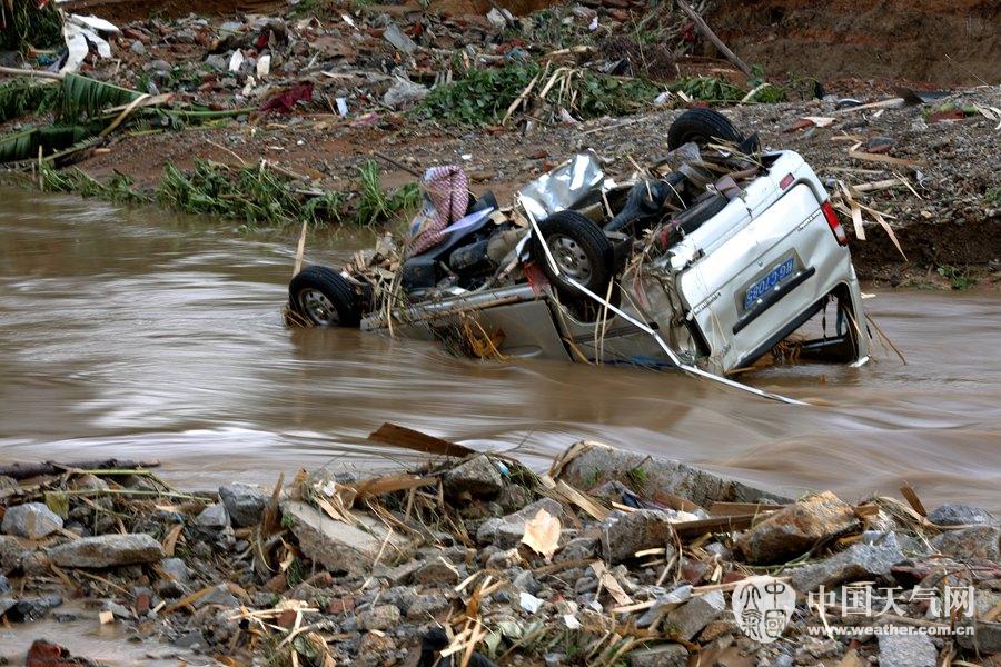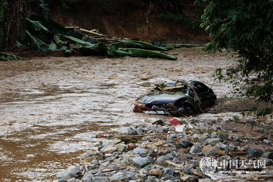 被洪水冲走的小车陷在河道里(摄影:刘英轶)