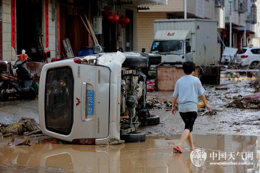 洪水退后,一辆小车侧躺在街道上(摄影:刘英轶)