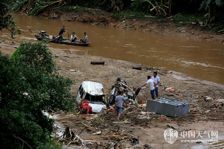 被洪水冲走的小车陷在河道里,已经面目全非(摄影:刘英轶)
