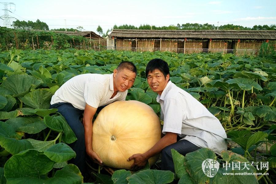 超级大南瓜需要两名成年男子才能勉强合抱起(摄影:田茂星)