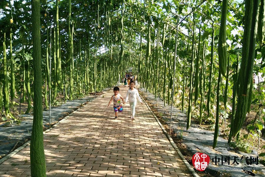 蔬菜观光长廊里,孩子在两米长的丝瓜林里玩耍(摄影:田茂星)