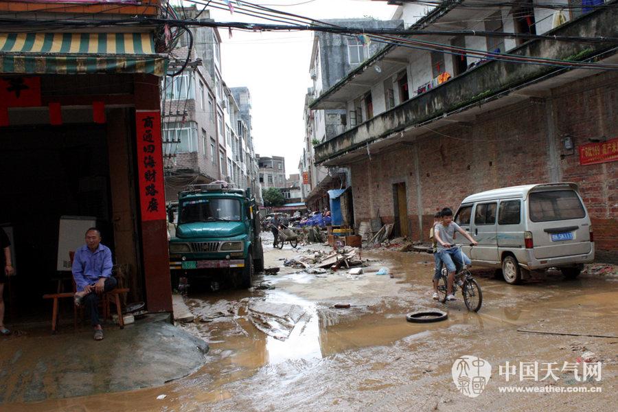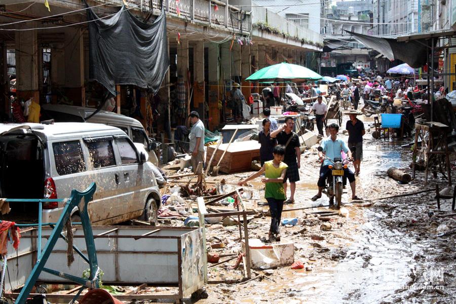 2日,沙垌市场洪水退去,街道上尽是淤泥(摄影:李书宇)