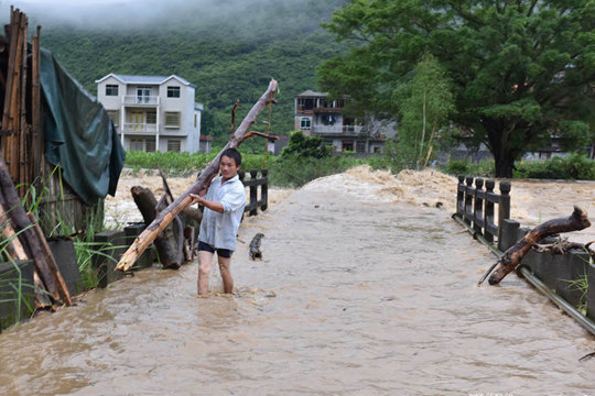 5日洪水稍退,村民小心翼翼地正在通过残破的吊桥。(摄影:蒋小芳)