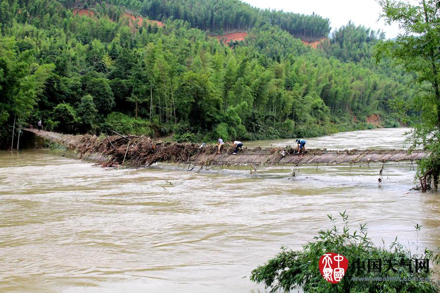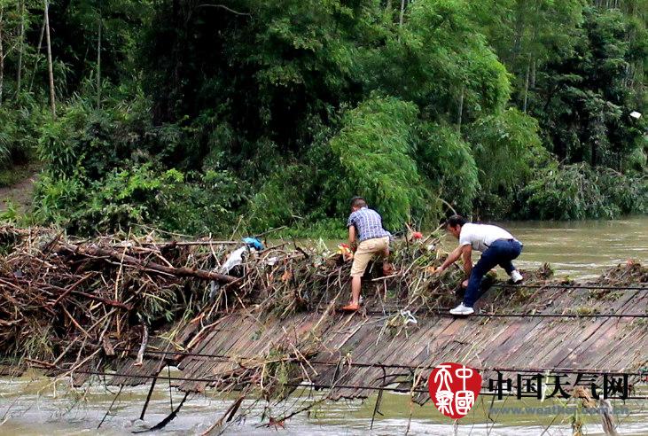 5日洪水稍退,吊桥重新露出水面,桥身全是杂草和树枝。(摄影:蒋小芳)