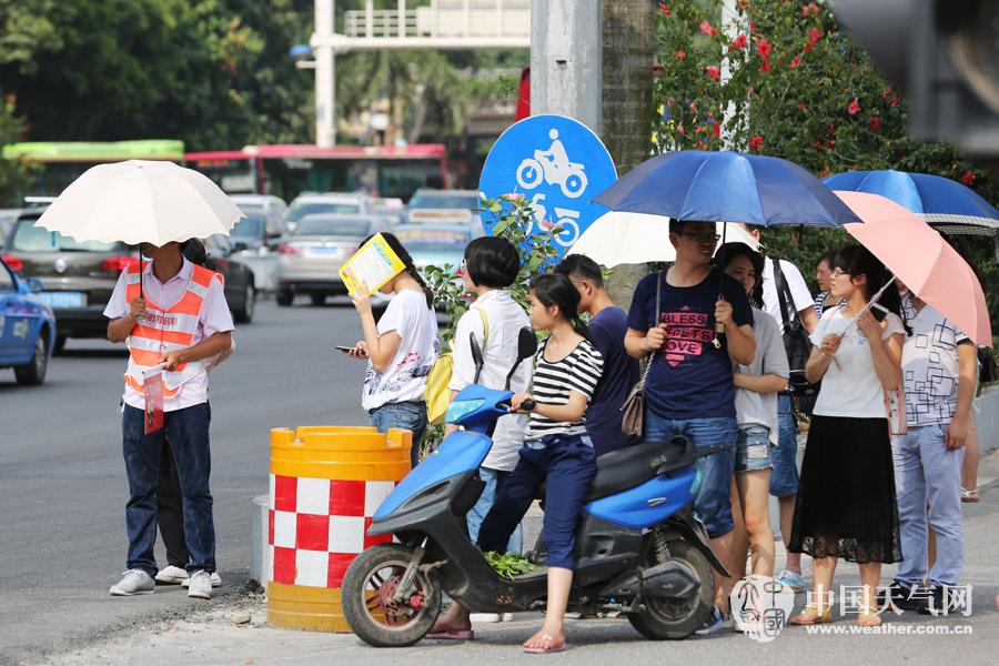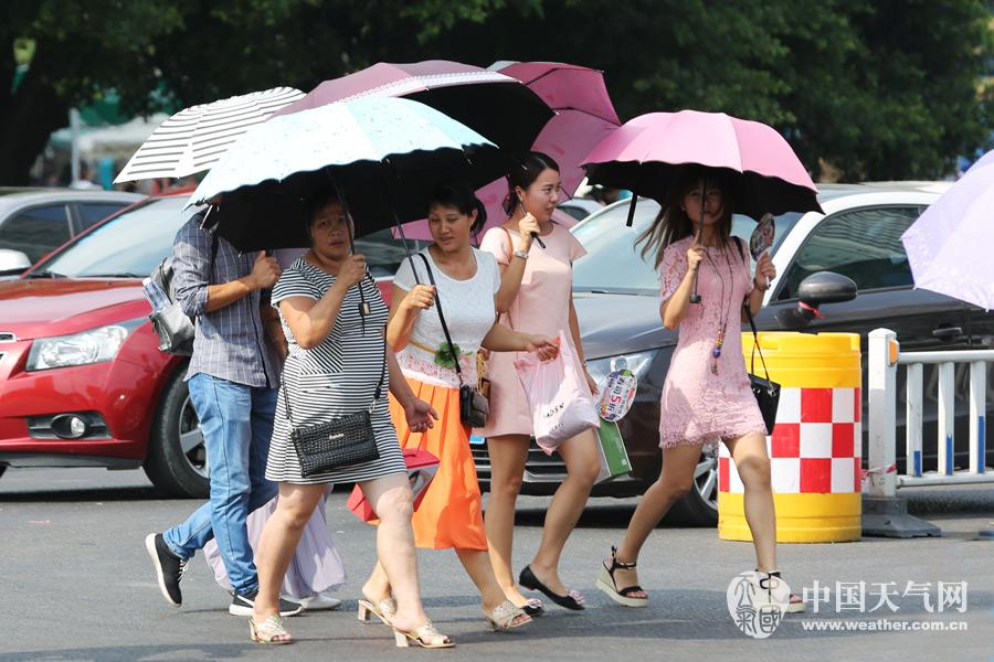 高温炙烤,行人纷纷打伞出行(摄影:刘英轶)