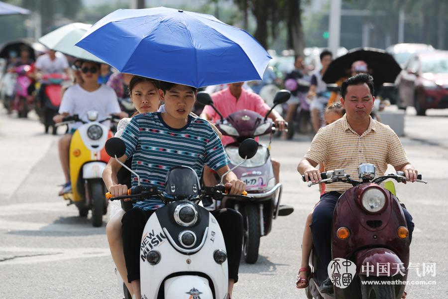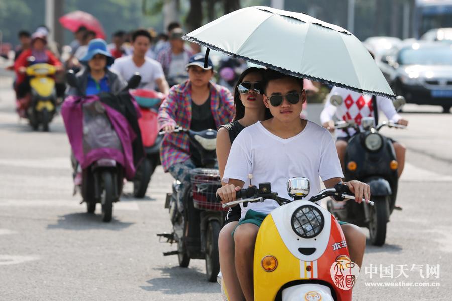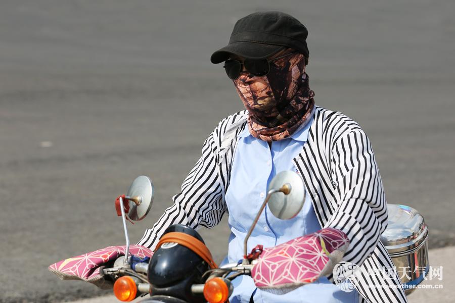 太阳猛烈,骑车出行的市民全副武装(摄影:刘英轶)